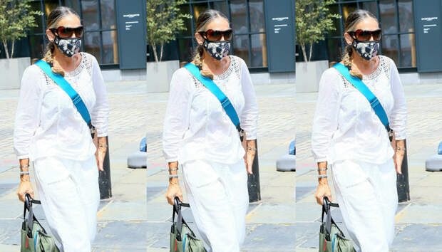 Сара Джессика сделала ставку на белоснежный тотал-лук - и определенно не прогадала. Этот цвет всегда актуален летом, а выбранный нашей героиней свободный фасон - идеальный вариант для палящего зноя. Актрисе приглянулась свободная прозрачная хлопковая блузка и укороченные спортивные брюки, которые она подняла чуть выше щиколотки. В качестве обуви она выбрала яркие голограммные босоножки на каблуке из собственной коллекции, стоимость которых составляет $159. Сара Джессика не стала отказываться от защитной маски: она предпочла модель в любимом модницами оттенке тай-дай. Финальным штрихом стали сразу две сумки: оливковый рюкзак ее бренда и переливающийся клатч через плечо - бизнеследи всегда есть что взять с собой, и миниатюрной сумочкой тут не обойтись.