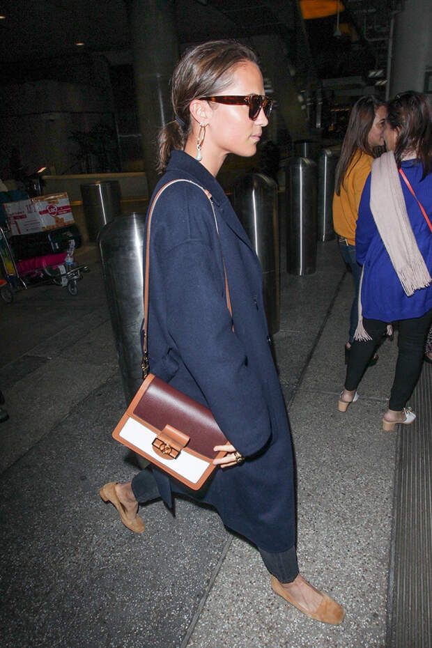 Фото звезд из аэропортов – нескончаемый источник вдохновения для повседневных образов. Алисия Викандер, например, предпочитает не следовать устаревшим модным правилам и легко сочетает в одном образе черный, синий и коричневый. Простой свитер, джинсы и пальто, но стоит добавить цвета (пусть и нейтрального), наряд сразу становится интереснее.