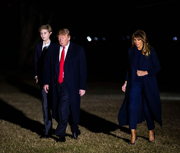 Минувшие выходные Мелания Трамп провела с супругом и сыном в солнечной Флориде. Президент и его семья решили сменить рабочие декорации Белого дома на живописные просторы курорта Мар-А-Лаго в Палм-Бич. Если "туда" первая леди отпарилась в тотал-луке оттенка кэмел, то для возвращения в Вашингтон она предпочла образ в цвете navy blue: брюки, джемпер, длинное пальто-кардиган и, конечно же, лодочки на шпильках полностью совпадали по оттенку.