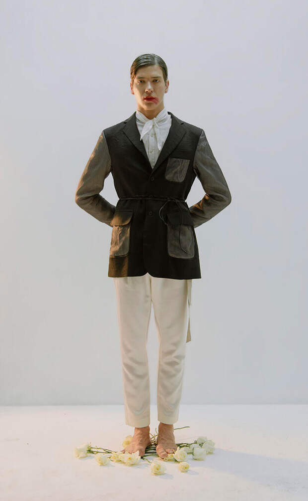 Цвета и цветы — главная движущая сила коллекции весна-лето 2019. Как правило, я много работаю с сочетанием черного и белого, но на этот раз решил разбавить его оранжевым, электрическим синим и почти телесным оттенком розового. В нашем ателье мы создали аппликацию в виде бутонов роз, а перед выходом моделей на подиум, добавили распустившиеся лилии. Это мой любимый цветок, у меня даже татуировка такая есть.