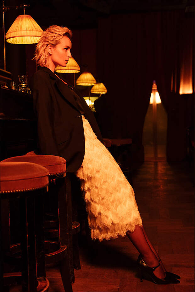 Жакет, MIU MIU; топ, INTIMISSIMI; юбка, POLINA GAGARINA x TEREKHOV GIRL; колготки, CALZEDONIA; туфли, PRADA