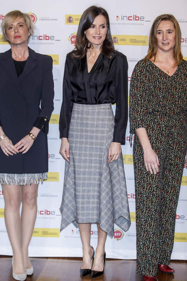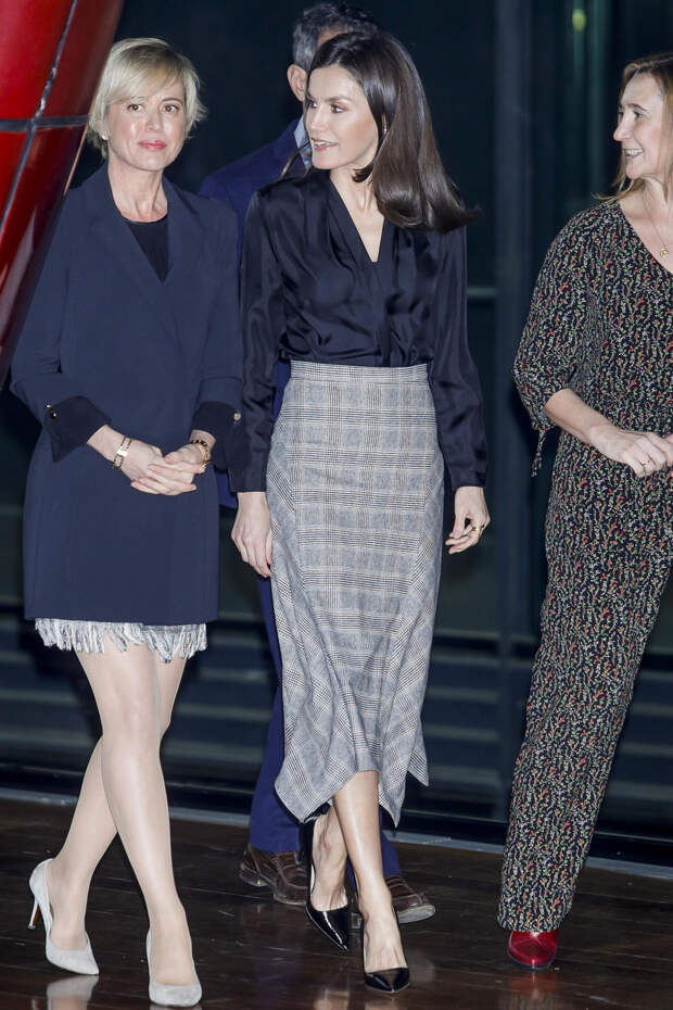 Она надела черную шелковую блузу и юбку-миди Massimo Dutti с высокой посадкой в серую клетку. Асимметричный подол юбки оживил весь образ. Этот испанский бренд горячо любим многими королевскими особами, включая герцогиню Кембриджскую и Сассекскую.