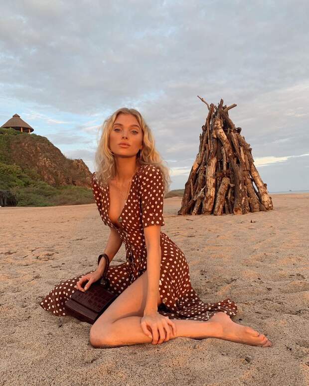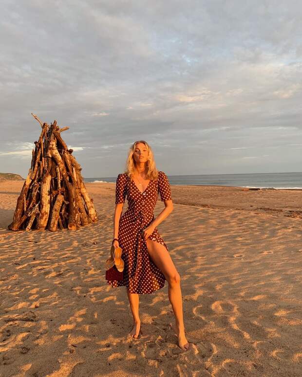 Как выглядит самое модное платье этого лоета? Ответ знает шведская топ-модель Эльза Хоск: для встречи заката на мексиканском побережье девушка выбрала платье в горошек из коллекции американского бренда LPA. Образ она дополнила кожаными мюлями бежевого цвета от Manolo Blahnik и маленькой сумкой By far с теснением под кожу рептилии.