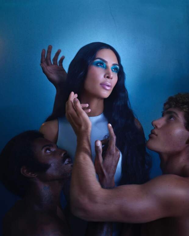 На других снимках из серии Ким позирует в окружении обнаженных мужчин, демонстрируя разные цвета блесков и теней в из новой коллекции. Удивительно, как Кардашьян смешивают откровенный секс и семейные ценности!