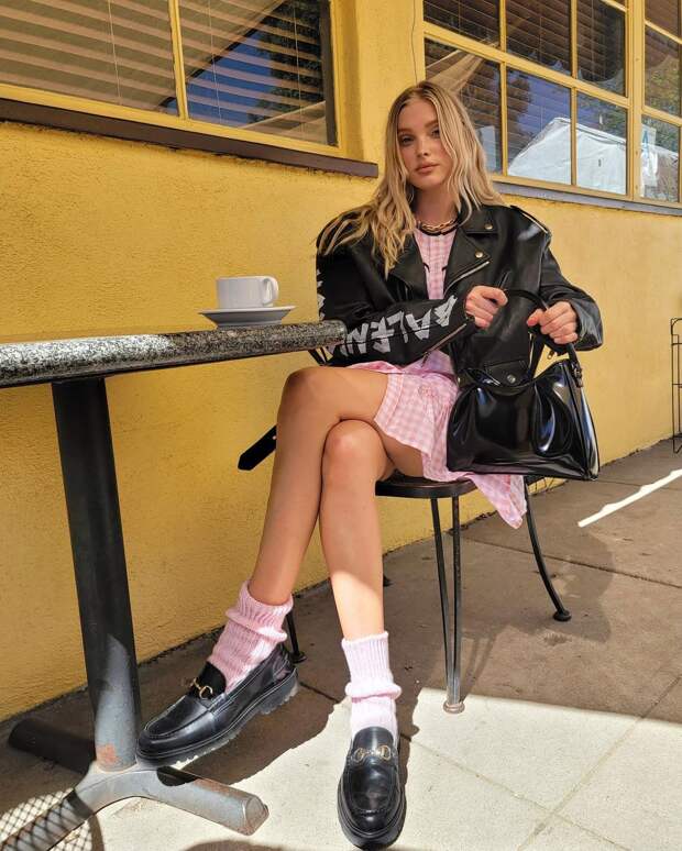 Лук топ-модели объединяет в себе сразу несколько актуальных трендов. Если сочетание носков с сандалиями еще может кого-то удивить, то носить подобным образом лоферы мы уже давно привыкли. Берите пример с Эльзы Хоск и добавьте в это классическое сочетание немного гранжа. Яркие носки, мини-платье с принтом и косуха — идеальные составляющие модного лука. Завершить образ помогут лаконичные колье и сумка-багет.