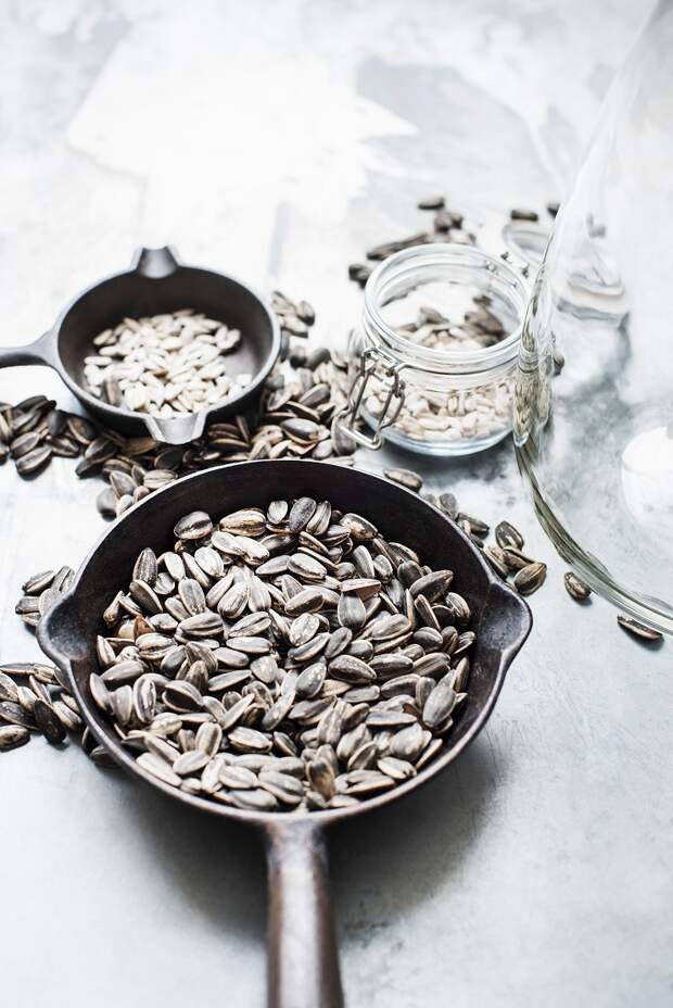 - Семена подсолнуха. Этот банальный продукт содержит около 30% дневной потребности организма в витаминах В3, В6, В5 и В9 на сто грамм семян.