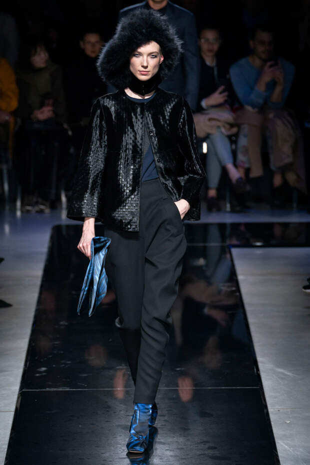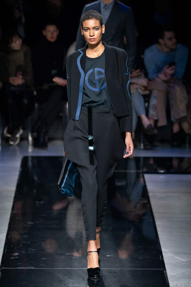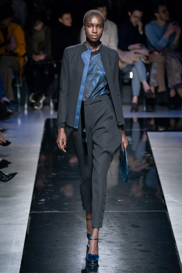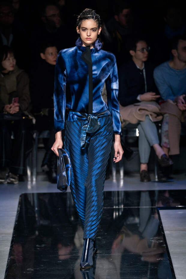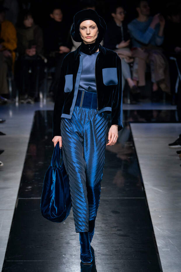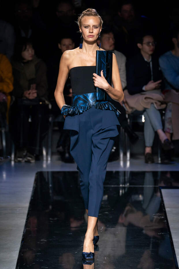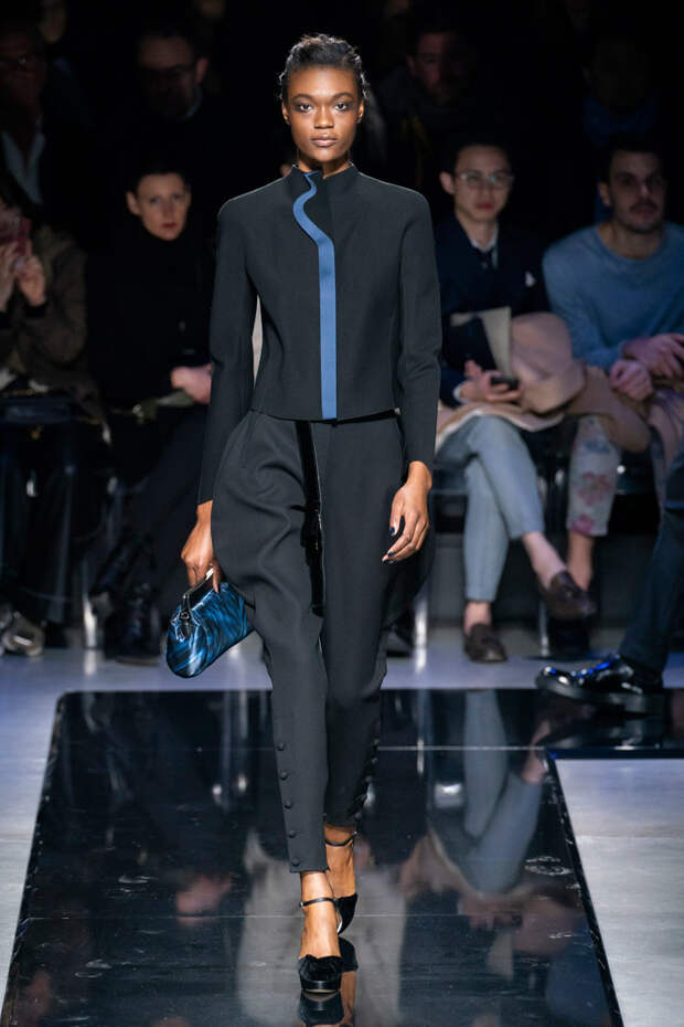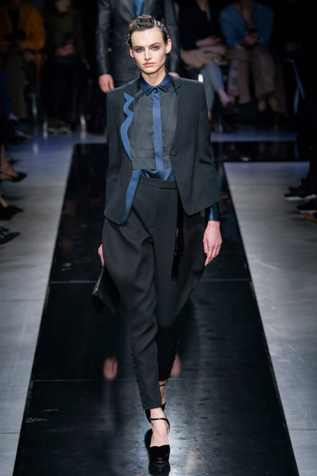 Мы носим oversize и любим ugly chic — так почему бы не дать шанс и этим брюкам? Тем более Джорджо Армани их подает максимально эффектно. С жакетами, напоминающими мундиры космических солдат благодаря электрической синей «разметке». С пышными, словно не сшитыми, а скрученными из сияющей ткани блузами. С пижамными рубашками и боа из перьев.