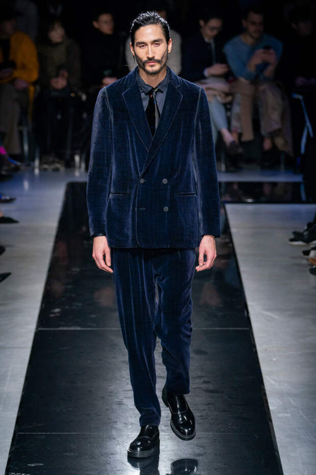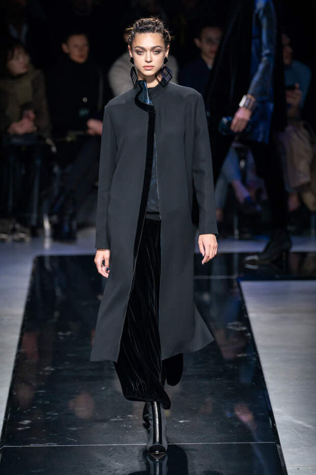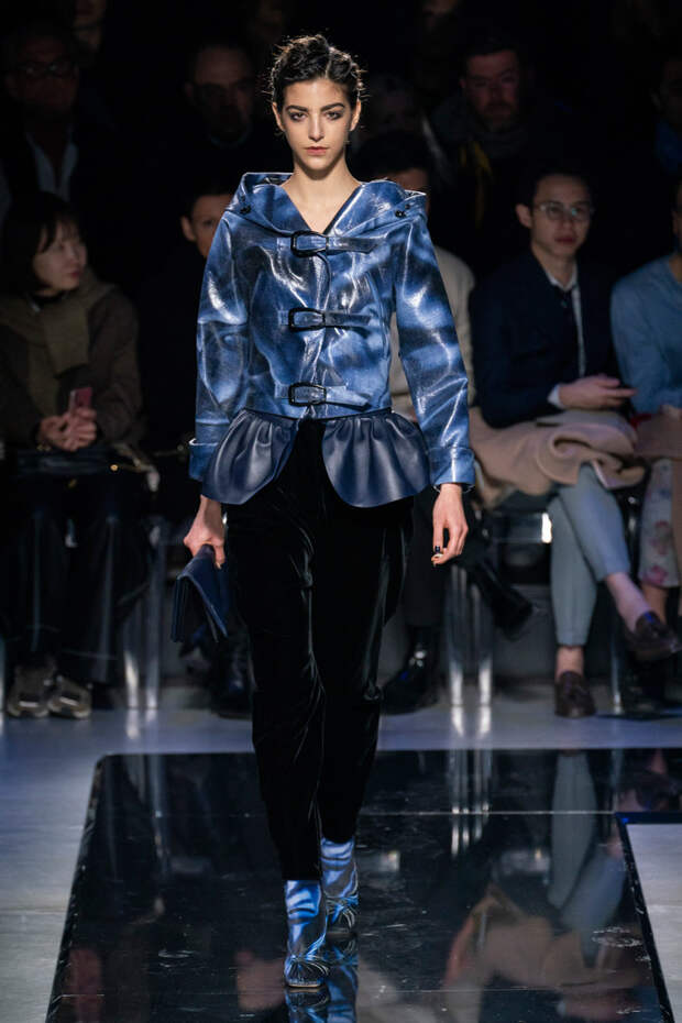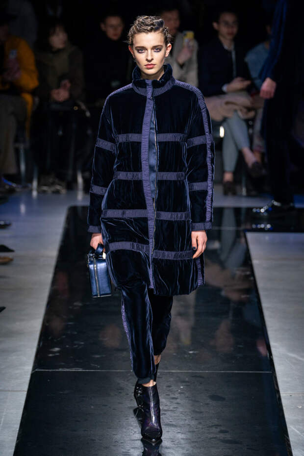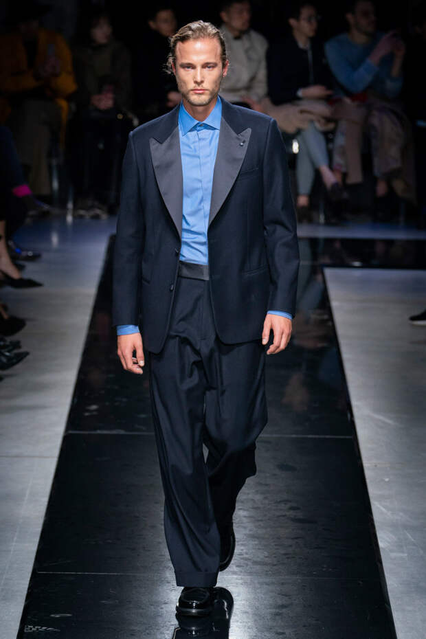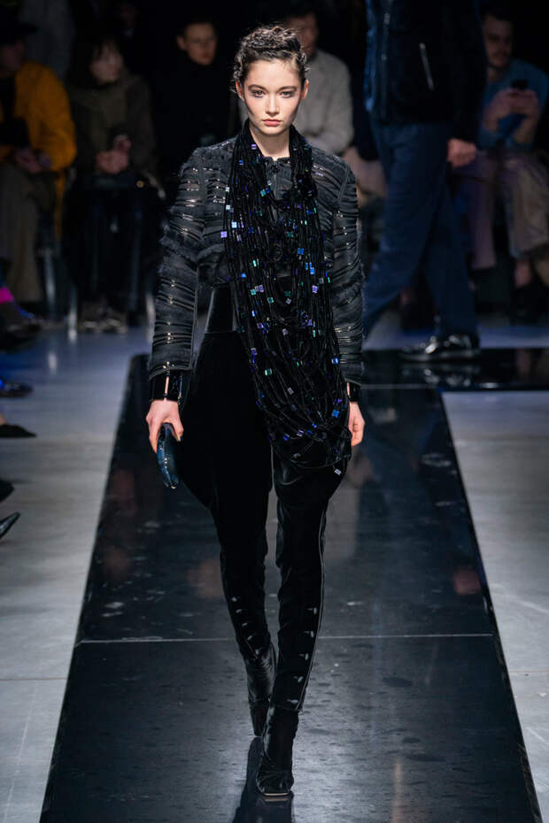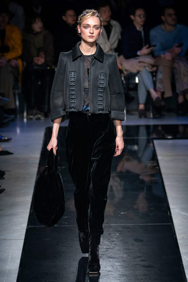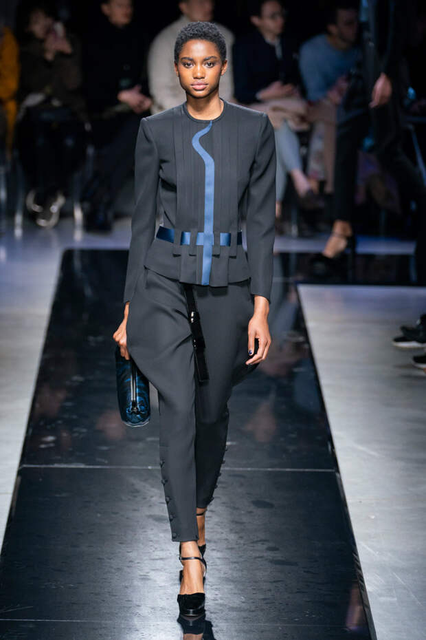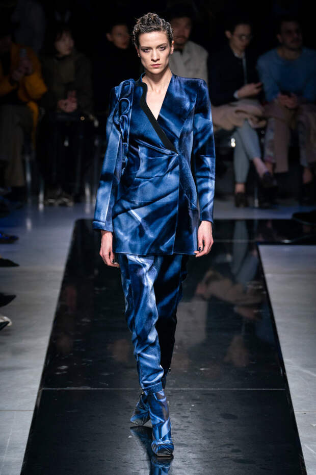 Мы носим oversize и любим ugly chic — так почему бы не дать шанс и этим брюкам? Тем более Джорджо Армани их подает максимально эффектно. С жакетами, напоминающими мундиры космических солдат благодаря электрической синей «разметке». С пышными, словно не сшитыми, а скрученными из сияющей ткани блузами. С пижамными рубашками и боа из перьев.