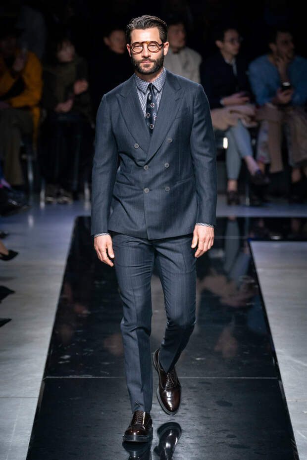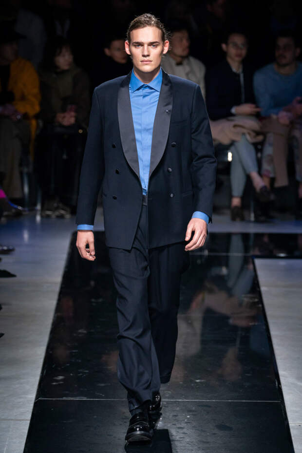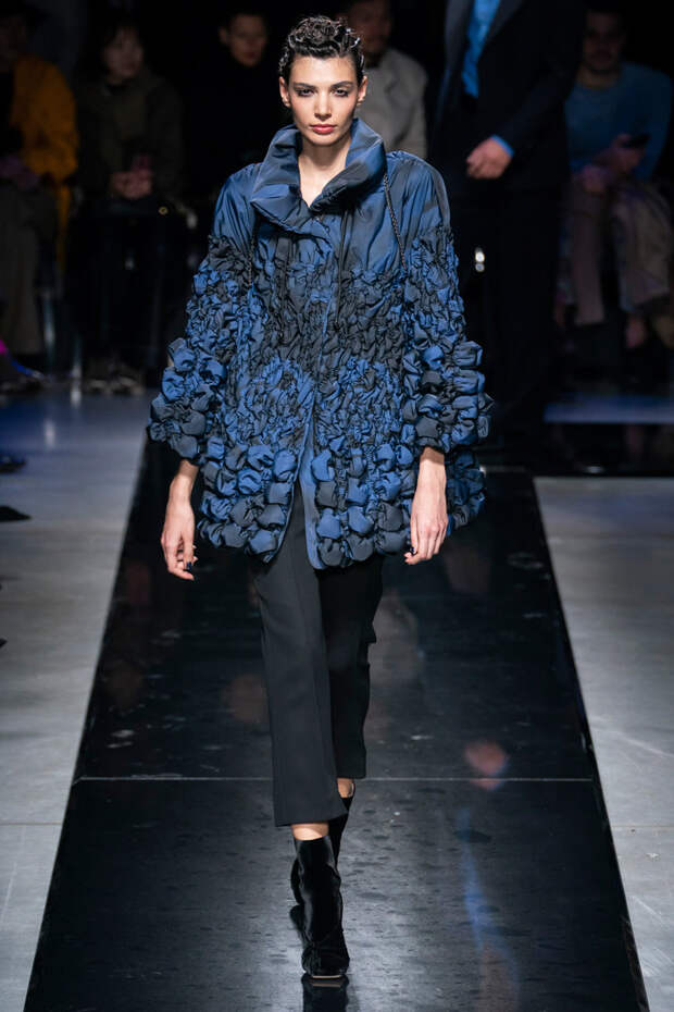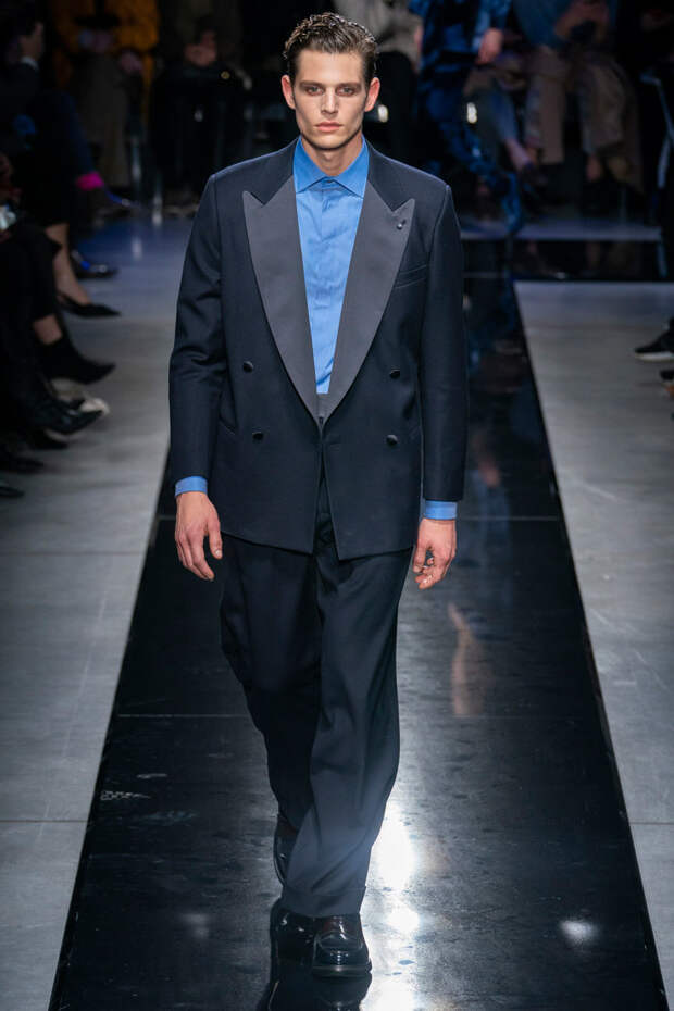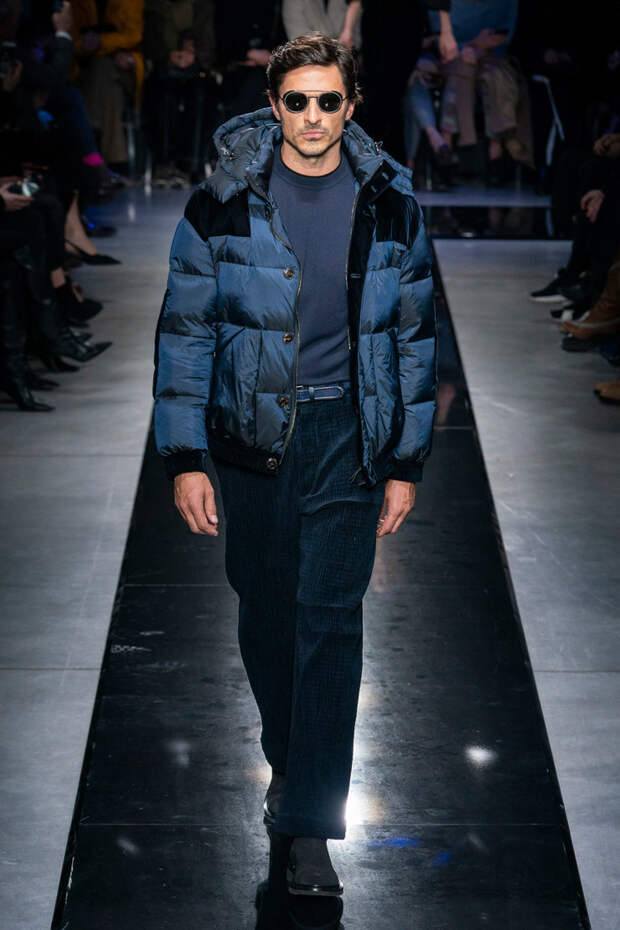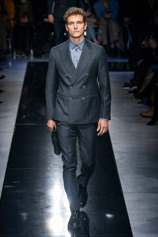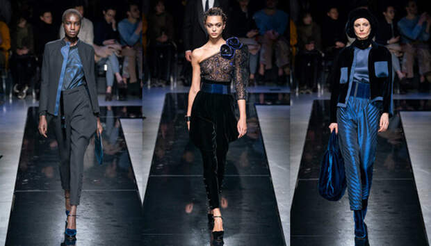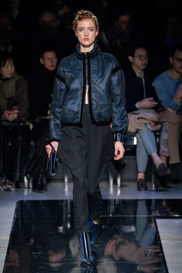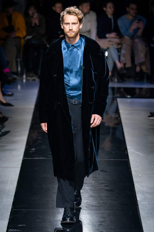 Мы носим oversize и любим ugly chic — так почему бы не дать шанс и этим брюкам? Тем более Джорджо Армани их подает максимально эффектно. С жакетами, напоминающими мундиры космических солдат благодаря электрической синей «разметке». С пышными, словно не сшитыми, а скрученными из сияющей ткани блузами. С пижамными рубашками и боа из перьев.