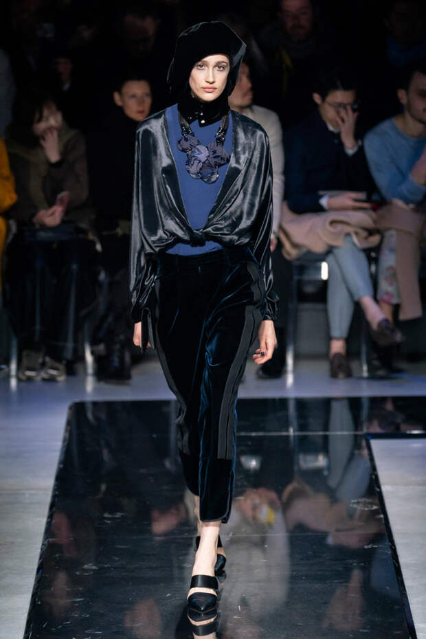 В остальном осенне-зимняя коллекция практически такая же, как и все предыдущие. В основе, как всегда, брючный костюм и вообще Брюки (на этот раз как раз галифе), половина вещей, по традиции, из бархата. Два главных цвета — снова черный и синий. Выглядит все прекрасно, но не совсем ясно, зачем делать коллекцию такой большой, если  основную идею уже донесли, а наполнение мало меняется из сезона в сезон.
