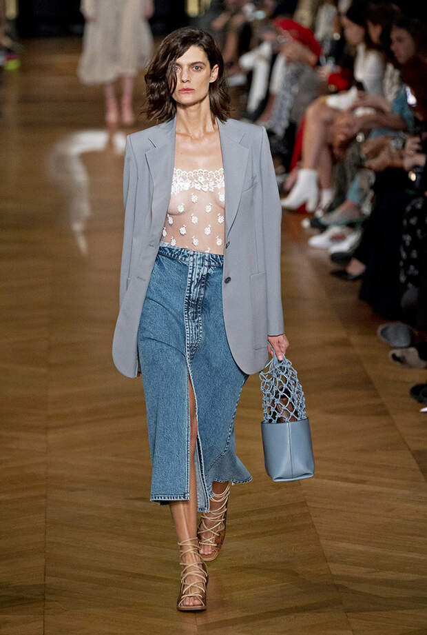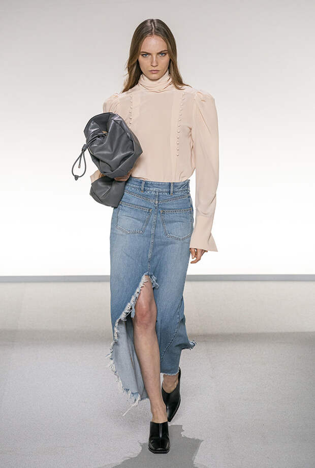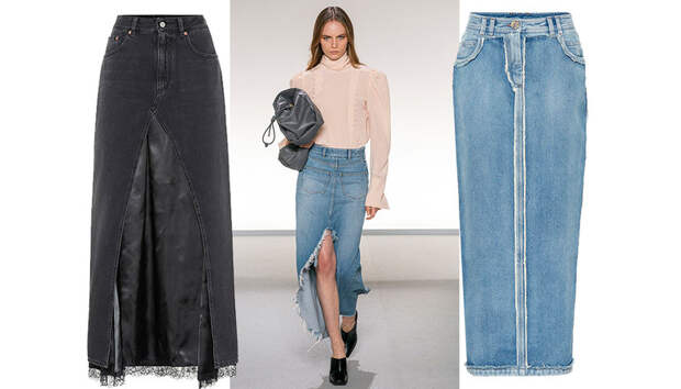 Длинные юбки из денима стали одним из главных трендов на модных показах сезона весна-лето 2020. Дизайнеры разных модных домов показали, насколько универсален этот предмет гардероба. На показе Stella McCartney мы увидели классический вариант с прозрачным топом и строгим оверсайз жакетом, Givenchy составили нежный романтичный образ со светлой юбкой и нежно-розовой блузкой в викторианском стиле, а Эди Слиман - креативный директор Celine - предлагает носить пышную джинсовую юбку с изысканным верхом и множеством золотых украшений.