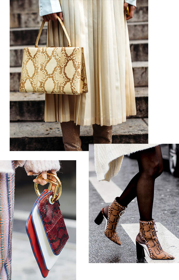 Если хотите быть в тренде, то без "змеиных" вещей в этом сезоне точно не обойтись. Но вовсе не обязательно носить тотал-луки из рептилии: достаточно обзавестись хищными аксессуарами и обувью. Не столь важно, будут ли это казаки как у Chloé или сапоги на шпильке как у Pollini; изящный клатч как у Tom Ford и Stella McCartney или вместительная сумка как у Loewe и Isabel Marant; широкий ремень как у Just Cavalli или кроссовки на грубой платформе как у Junya Watanabe и Comme des Garçons.