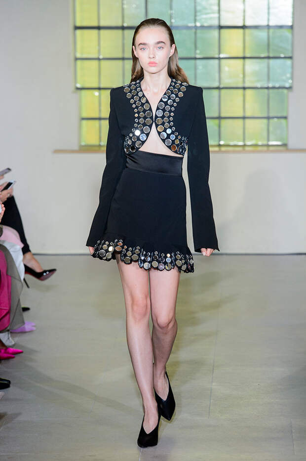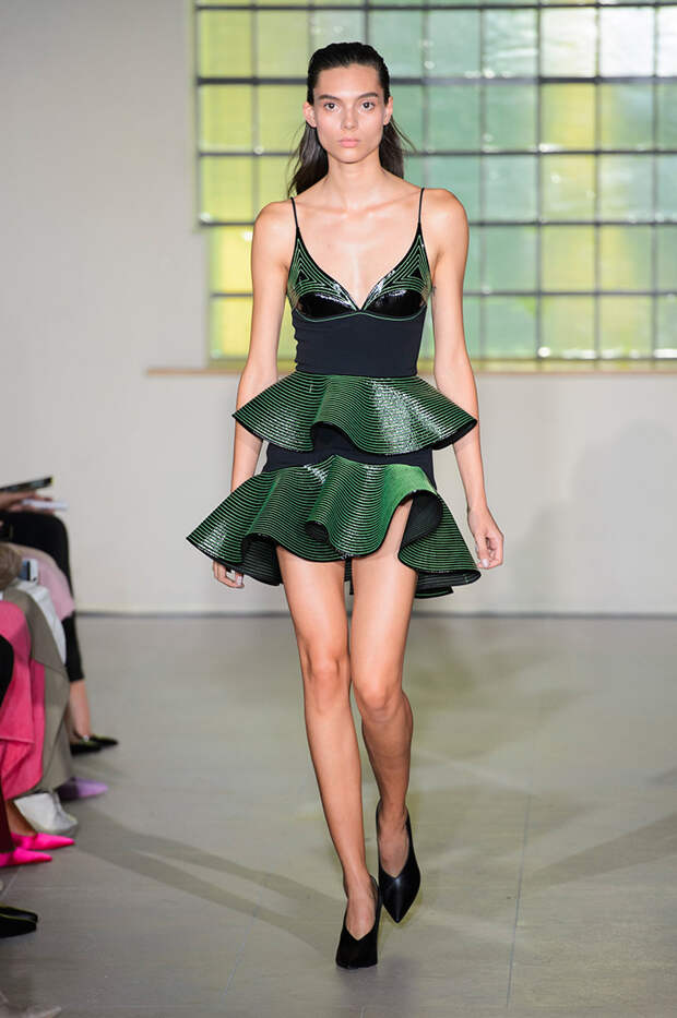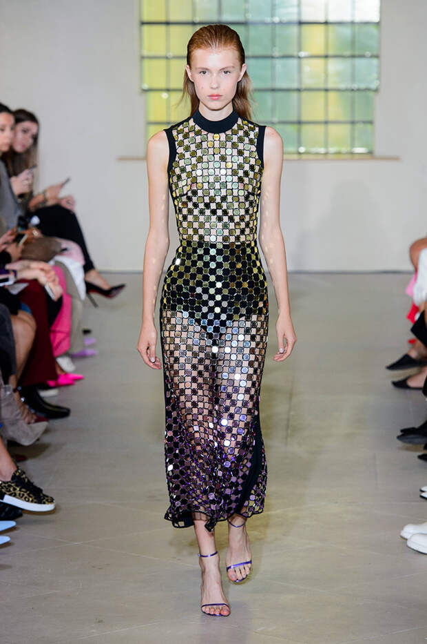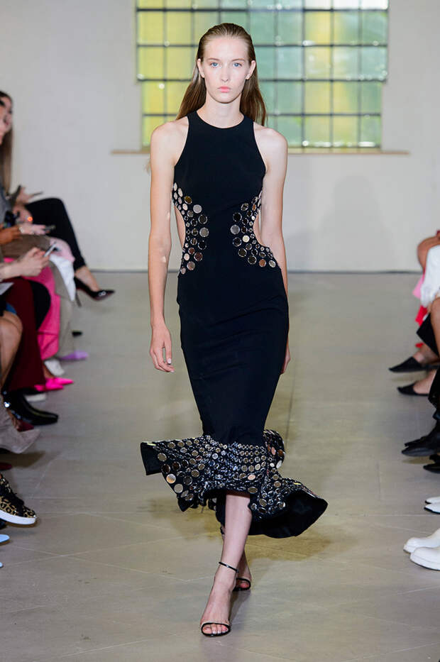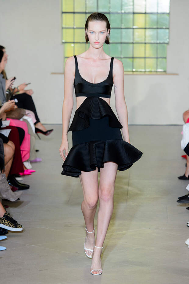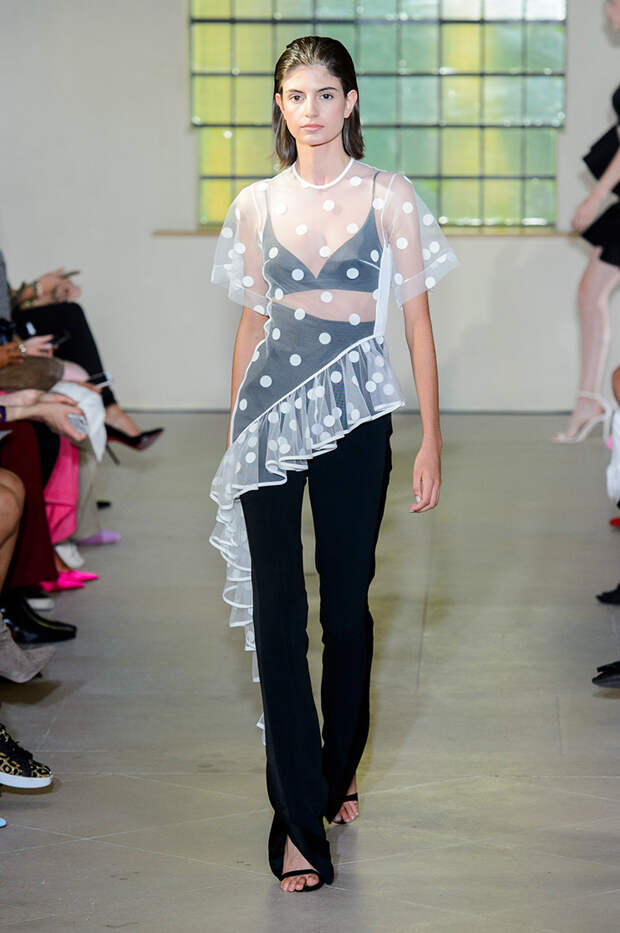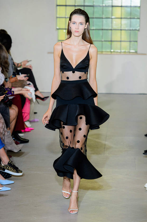 Давид Кома заигрывает с эпохой 80-х второй сезон подряд — в его весенне-летнем шоу можно найти много общего с тем, что он предлагал в круизный коллекции 2018. Сам грузинский дизайнер еще летом признавался, что хотел показать то время сквозь собственную призму, и ему это снова удалось: популярные тогда воланы помещены у Комы на обтягивающие платья с разрезами, которые легко представить в каком-нибудь фильме о будущем; горох, который часто ассоциируется с инфантильностью и нежностью, встречается на полупрозрачных платьях с тонкими лямками и акцентом на декольте; есть модели, полностью выполненные из пластиковых или зеркальных пластин, а также пайеток, которые наверняка оценили бы дивы как 80-х, так и сегодняшнего дня.