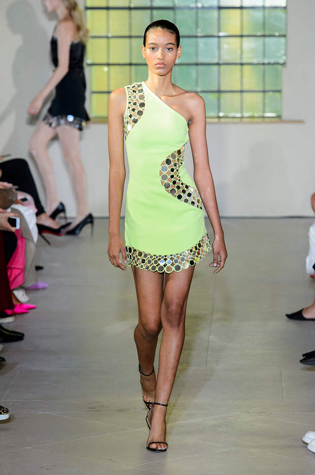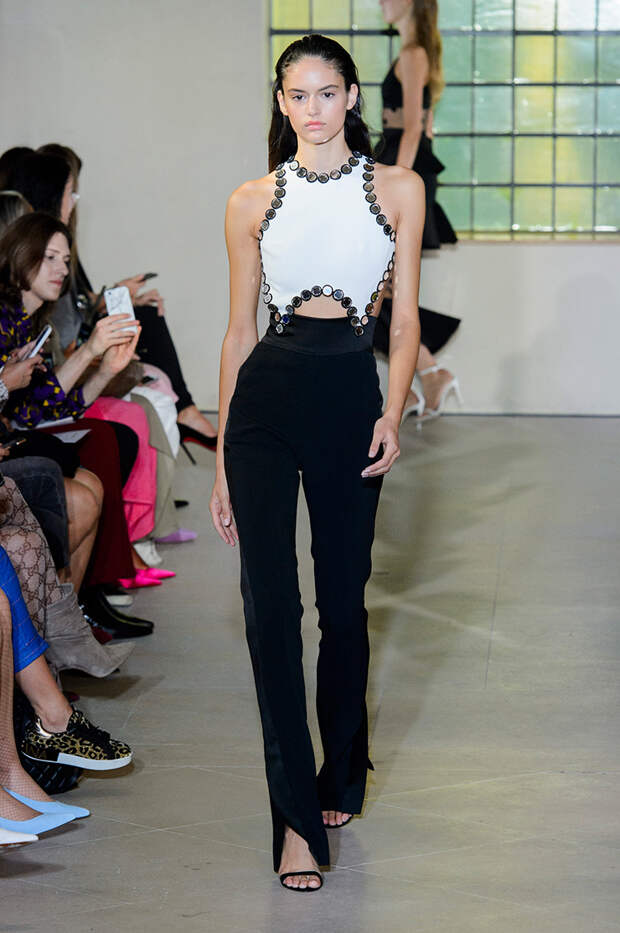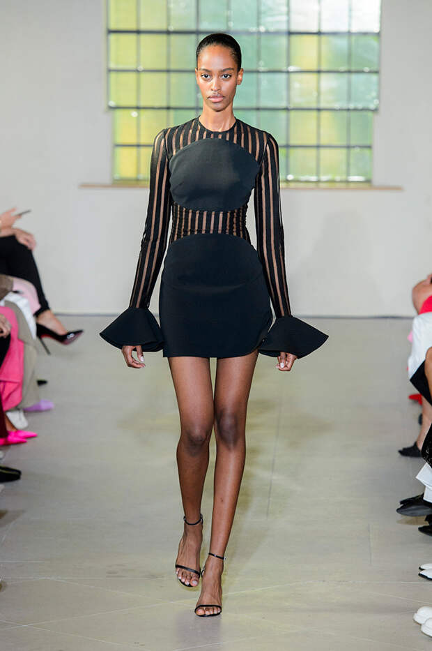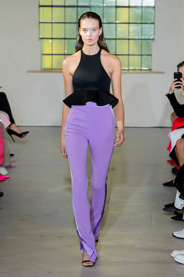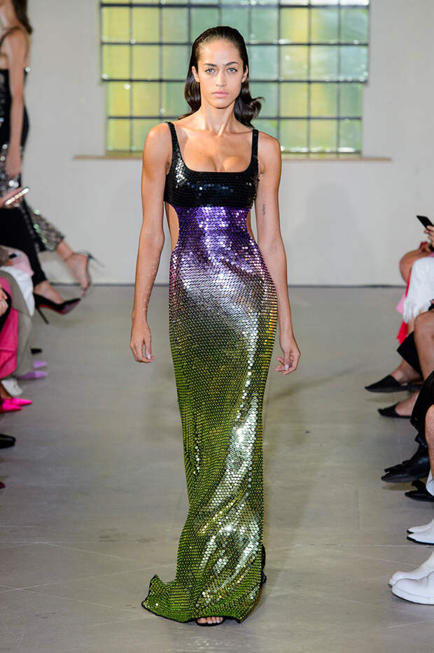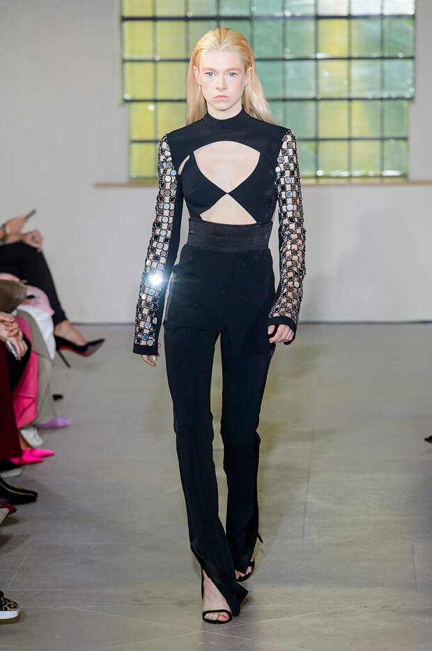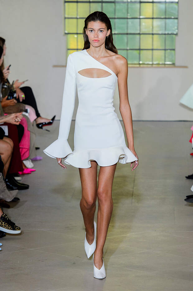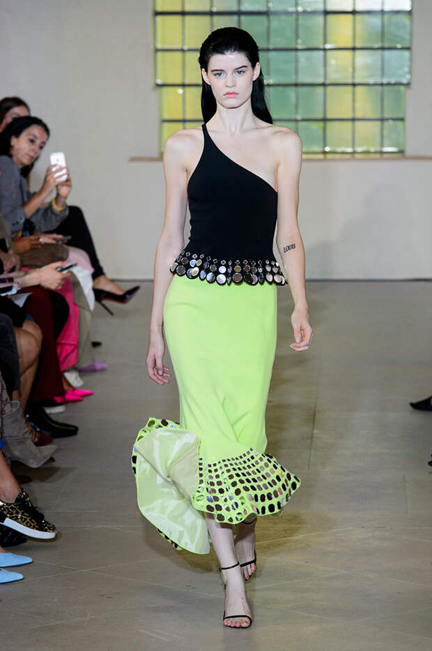 Давид Кома заигрывает с эпохой 80-х второй сезон подряд — в его весенне-летнем шоу можно найти много общего с тем, что он предлагал в круизный коллекции 2018. Сам грузинский дизайнер еще летом признавался, что хотел показать то время сквозь собственную призму, и ему это снова удалось: популярные тогда воланы помещены у Комы на обтягивающие платья с разрезами, которые легко представить в каком-нибудь фильме о будущем; горох, который часто ассоциируется с инфантильностью и нежностью, встречается на полупрозрачных платьях с тонкими лямками и акцентом на декольте; есть модели, полностью выполненные из пластиковых или зеркальных пластин, а также пайеток, которые наверняка оценили бы дивы как 80-х, так и сегодняшнего дня.