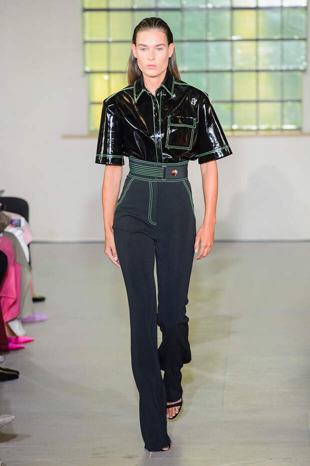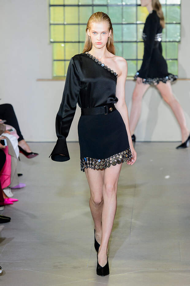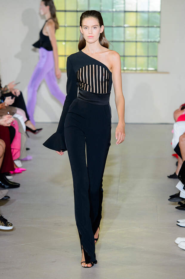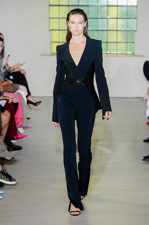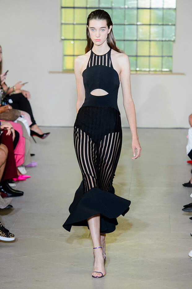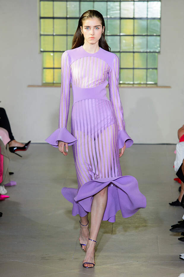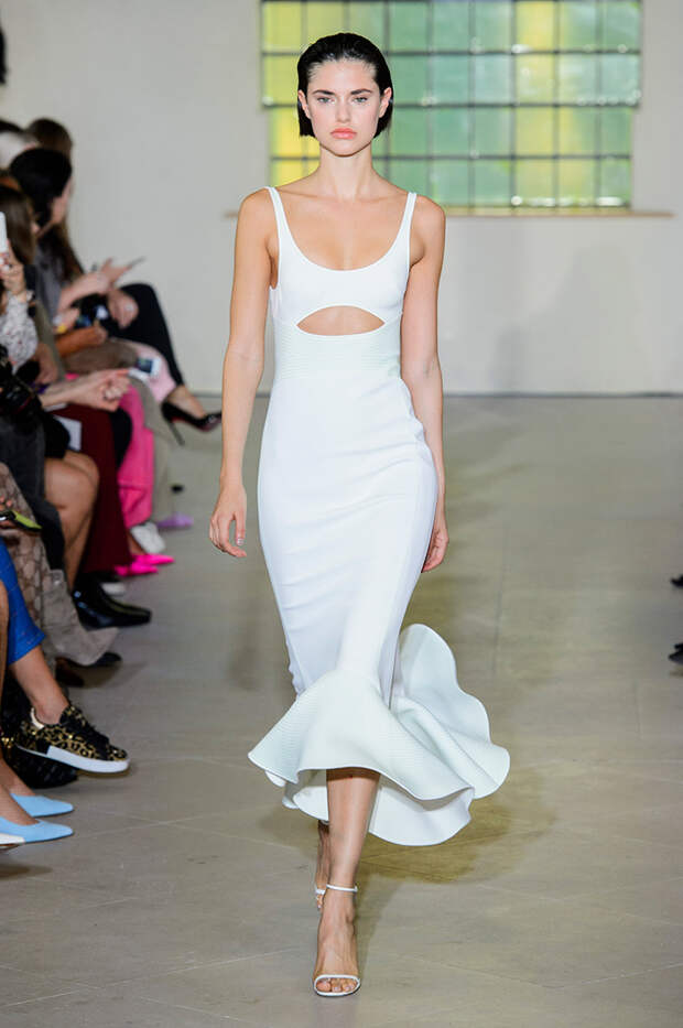 Давид Кома заигрывает с эпохой 80-х второй сезон подряд — в его весенне-летнем шоу можно найти много общего с тем, что он предлагал в круизный коллекции 2018. Сам грузинский дизайнер еще летом признавался, что хотел показать то время сквозь собственную призму, и ему это снова удалось: популярные тогда воланы помещены у Комы на обтягивающие платья с разрезами, которые легко представить в каком-нибудь фильме о будущем; горох, который часто ассоциируется с инфантильностью и нежностью, встречается на полупрозрачных платьях с тонкими лямками и акцентом на декольте; есть модели, полностью выполненные из пластиковых или зеркальных пластин, а также пайеток, которые наверняка оценили бы дивы как 80-х, так и сегодняшнего дня.