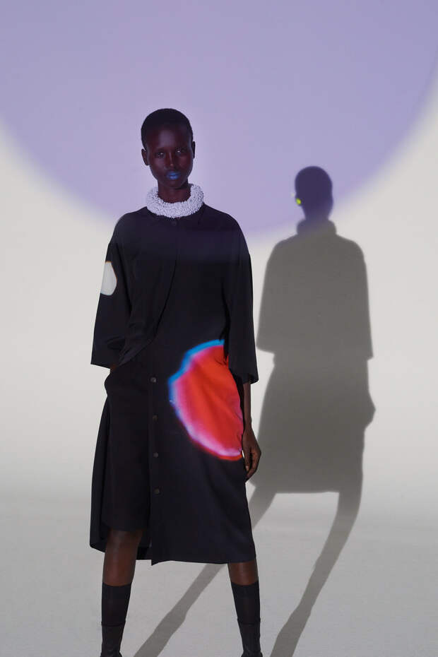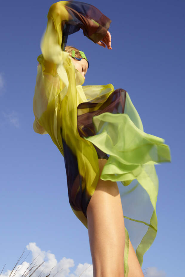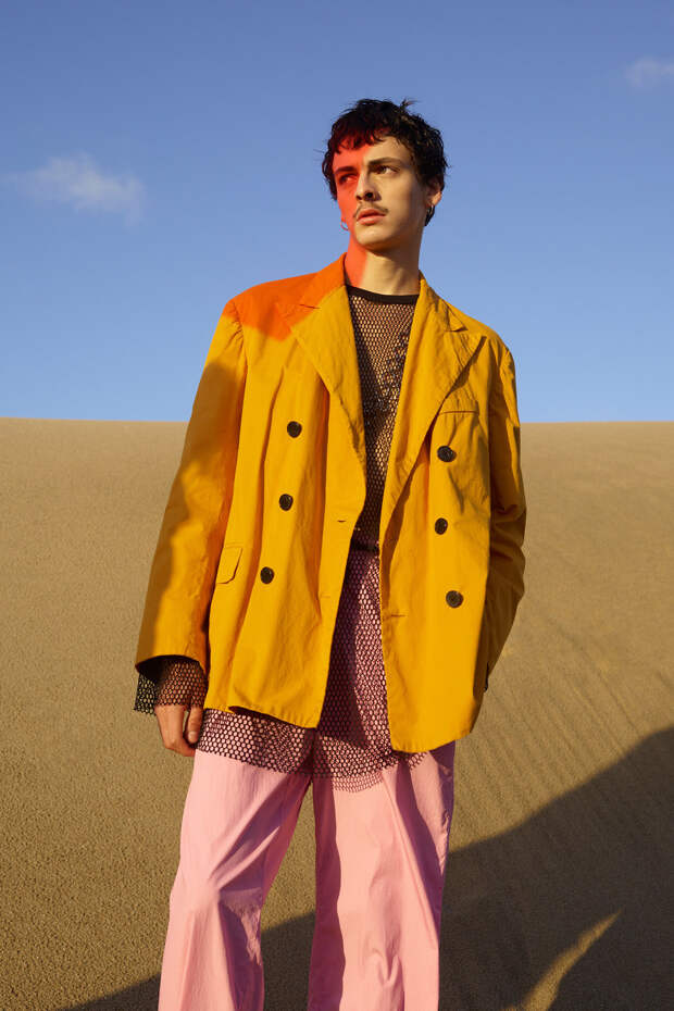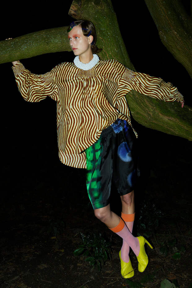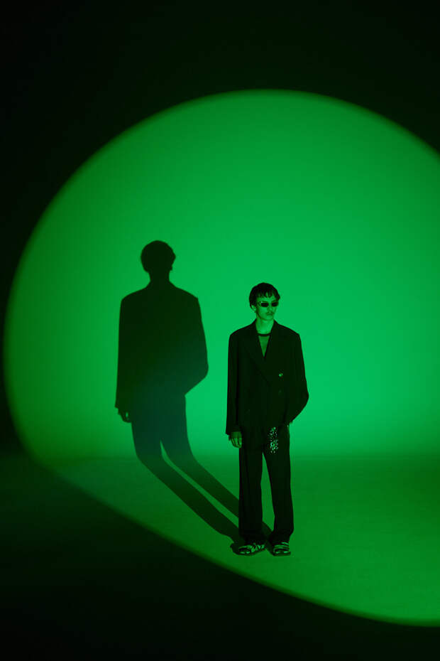Не изменил он себе и в этот раз: так, в одной из рубашек нашлось место сразу для голубого, розового, фиолетового, желтого и оранжевого цветов! Забудьте старые "правила трех оттенков" и дайте волю фантазии — вот к чему нас подталкивает эта одежда. И к тому, чтобы прислушаться к собственным мыслям и ощущениям: об этом буквально кричит драпированный топ в оттенке лайма с вышитой стеклярусом надписью YOU.В целом связующим звеном между всеми луками стали три элемента: флюоресцентные оттенки, диджитал-принты и сетка, из которой сделаны мужские и женские топы и лонгсливы. И есть что-то очень противоречивое, но при этом очень гармоничное в том, чтобы показать все это буйство электрических цветов именно на фоне природы. Ван Нотен как бы намекает на очередную дихотомию, сочетание несочетаемого как свой любимый прием. И от этого, как обычно, только выигрывает.