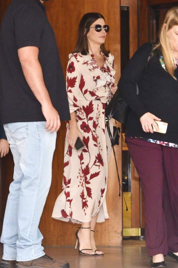 Для встречи с бразильскими поклонниками 54-летняя Буллок выбрала бежевое платье с запахом от Johanna Ortiz с объемными рюшами на груди и цветочным принтом, надев его в паре с босоножками на тонких перемычках.