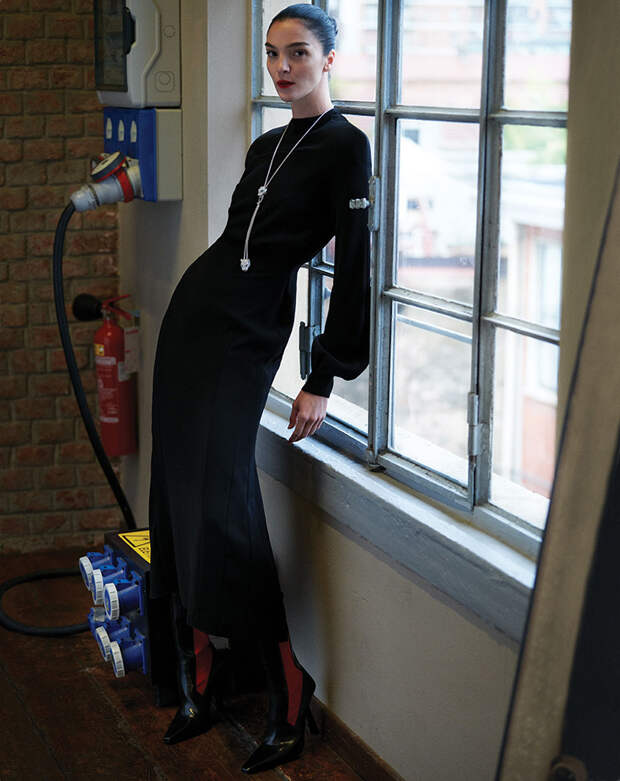 ПАЛЬТО, Sacai; КОМБИНЕЗОН, ПОЯС И САПОГИ, Salvatore Ferragamo; КОЛЬЕ GÉOMÉTRIE & CONTRASTE, Cartier High Jewelry (БЕЛОЕ ЗОЛОТО, ОНИКС, ГОРНЫЙ ХРУСТАЛЬ, БРИЛЛИАНТЫ); СЕРЬГИ PLUIE DE CARTIER, Cartier High Jewelry (БЕЛОЕ ЗОЛОТО, БРИЛЛИАНТЫ)
