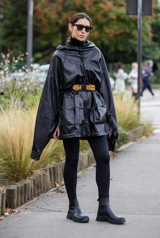 Самый простой, но оттого не менее действенный способ – носить облегающие брюки с массивным "верхом". Свободная куртка из эко-кожи цвета, пиджак «с мужского плеча» или оверсайз-свитером в форме облака – решать вам. Последний вариант сделает силуэт гармоничнее.