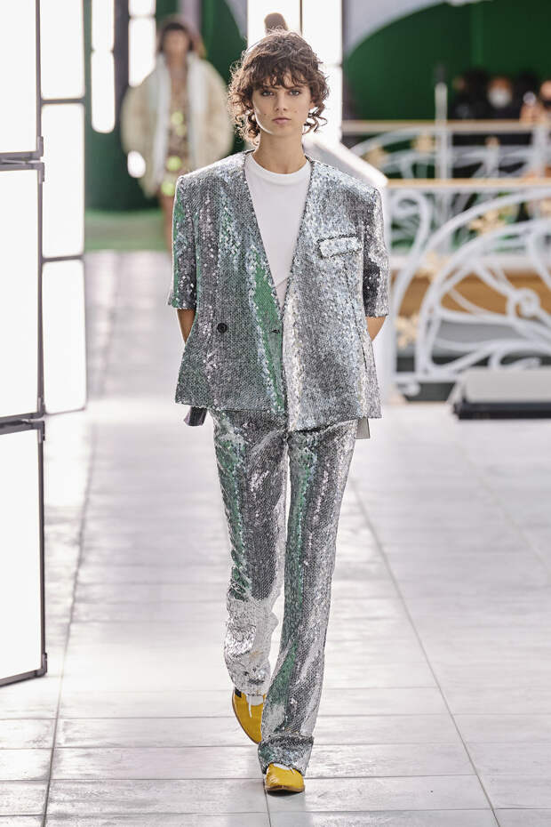 Отдельного внимания заслуживает блестящий (во всех смыслах) тейлоринг — безупречно скроенные угловатые пиджаки, часть из которых сделана в тканях с сияющими серебристыми пайетками. Традиционно сильными для Дома оказались аксессуары, в особенности сумки-конверты на массивных цепях (все еще не теряющих актуальности) и крупные ремни, как бы завязанные на талии узлами.