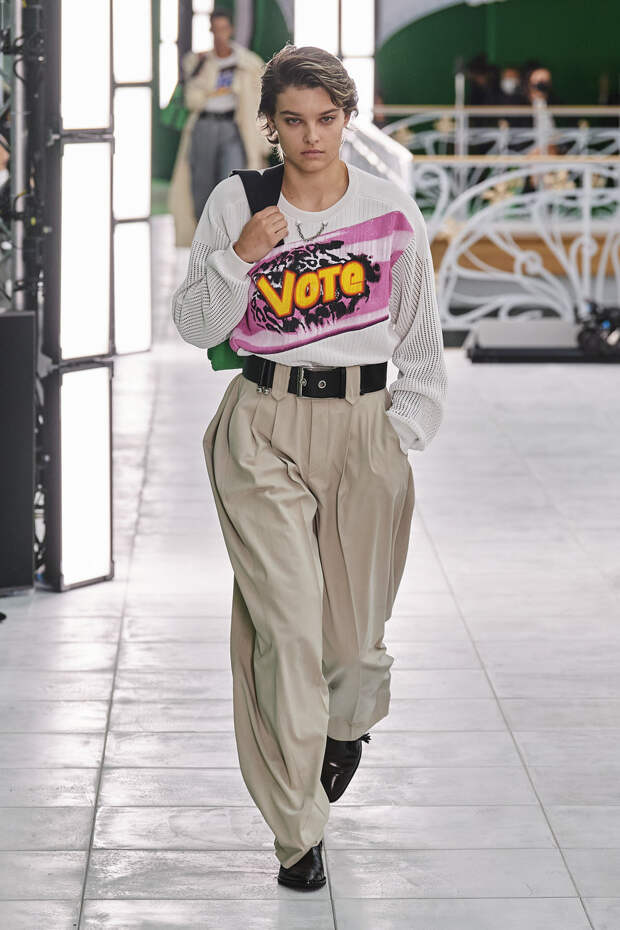 Свою новую коллекцию для Louis Vuitton Николя Жескьер открыл кратким, но емким политическим лозунгом. Надпись на белом свитшоте гласит "Vote" — и не нужно быть экспертом в политике, чтобы понять, кому она адресована. В США скоро начнутся президентские выборы, уже негласно объявленные самыми важными в истории страны.