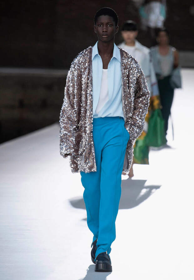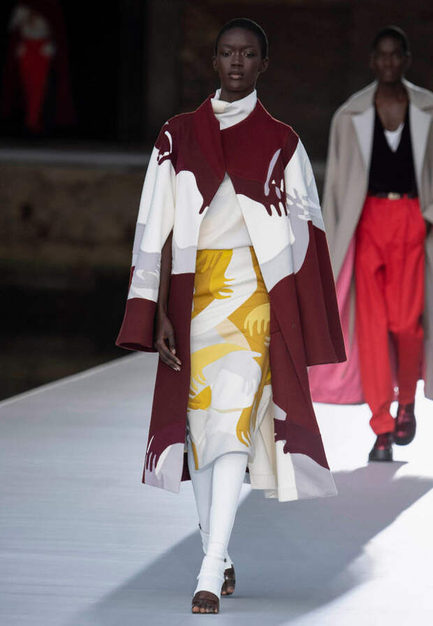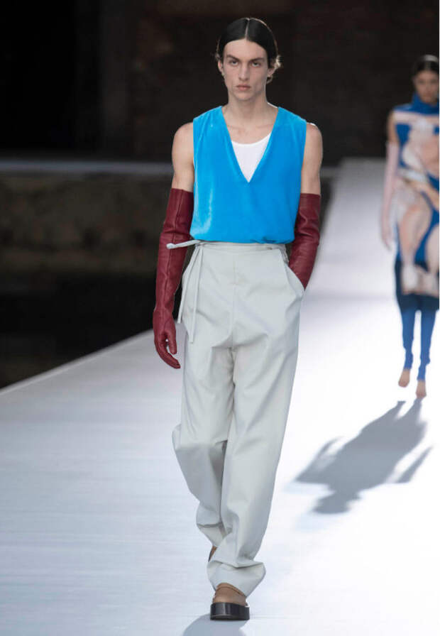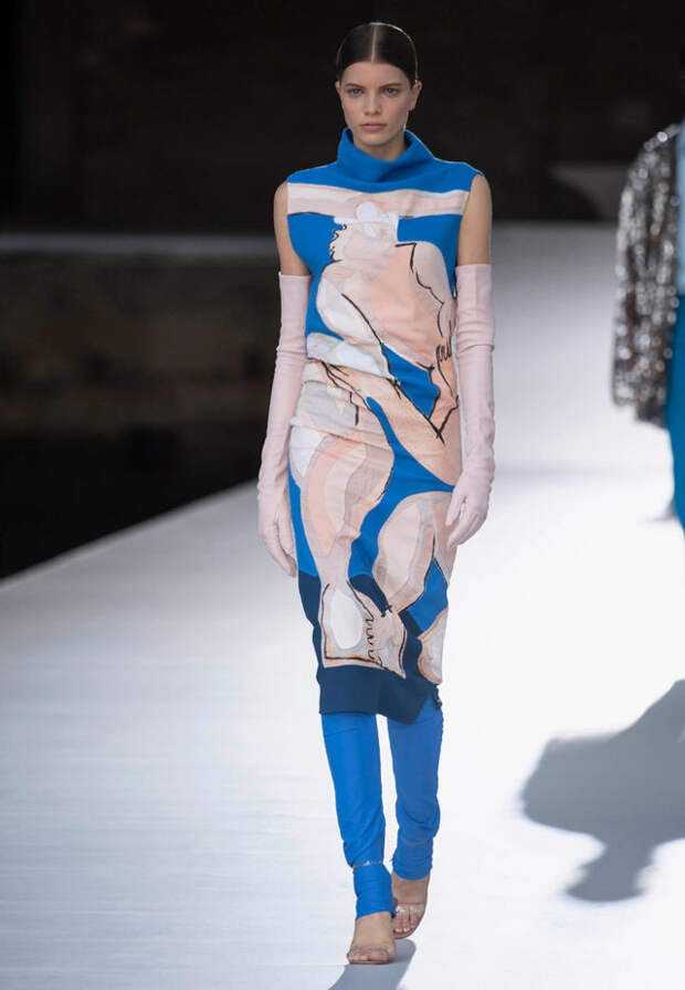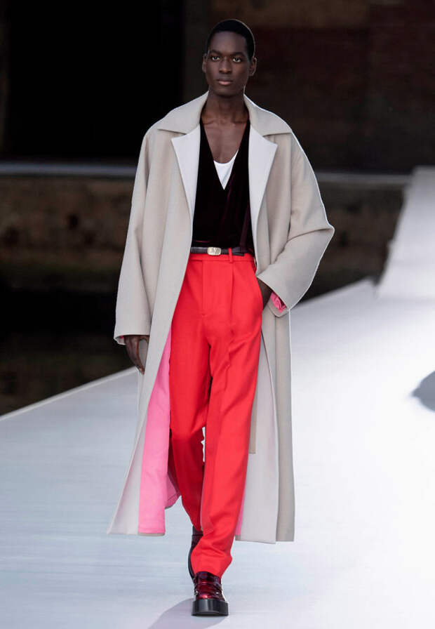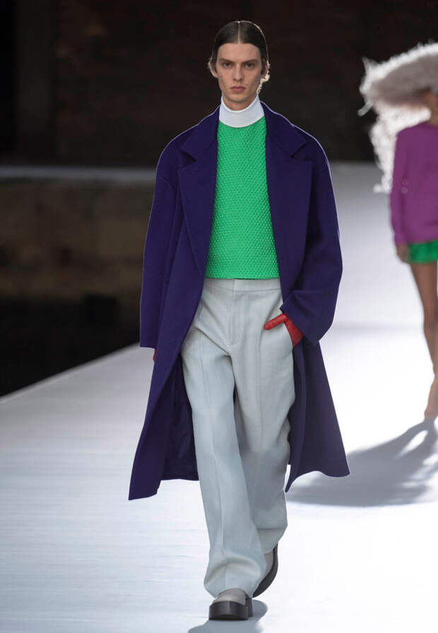 Первое, что бросается в глаза — потрясающие сочетания цветов, которые для Valentino уже стали визитной карточкой. Пиччоли — редкий дизайнер, который чувствует цвет так же тонко, как большие художники. Кейп цвета свежей сирени с лимонными перчатками, неоновый оттенок лайма с фуксией, или даже три разных оттенка зеленого в одном образе — он каждый раз ухитряется найти неочевидные, но такие гармоничные цветовые комбо, что разглядывать их хочется буквально часами. Впрочем, в случае с этой коллекцией аналогия с живописцами не случайна: на многих вещах, включая вечерние платья и мужские брючные костюмы, появились принты с фрагментами картин современного художника Алессандро Теолди, известного своими изображениями разноцветных человеческих силуэтов. «Приручить» Пьерпаоло смог даже капризные неоновые оттенки, которые при неправильно использовании легко могут сделать образ чересчур повседневным. Здесь этого не произошло — бальные платья с кринолинами в «кислотных» оттенках смотрятся на удивление гармонично.