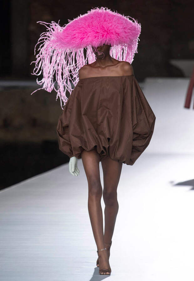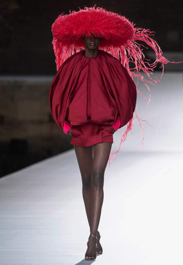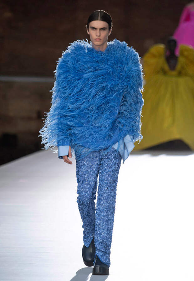 Еще одна ключевая деталь коллекции (и знаковая вещь для Пиччоли в принципе) — огромные шляпы-медузы из перьев, которые впервые появились в кутюрной коллекции Valentino весна-лето 2018.