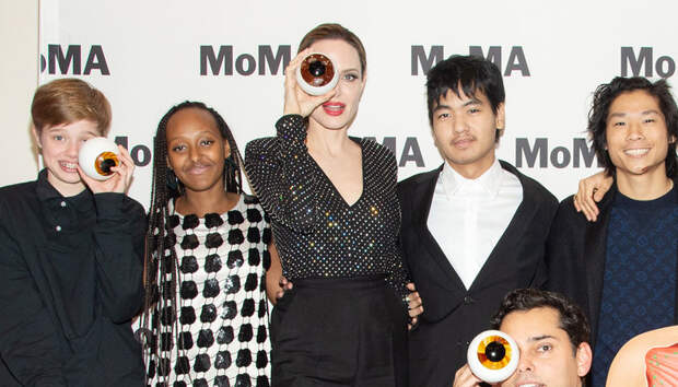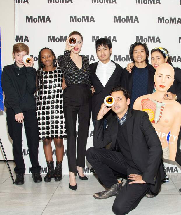 К примеру, вчера актриса посетила выставку и фестиваль документального кино в Нью-Йоркском музее современного искусства, взяв за компанию Шайло, Захару, Пакса и Нокса. При этом выглядела Джоли как героиня красной дорожки: Анджелина отправилась на экскурсию в прямых черных брюках со стрелками, облегающем топе с глубоким вырезом и переливающимися стразами, лодочках на высокой шпильке и с алой помадой, а особенно внимательные даже заметили у многодетной мамы накладные ресницы — Энджи явно готова ко встрече с новым бойфрендом.