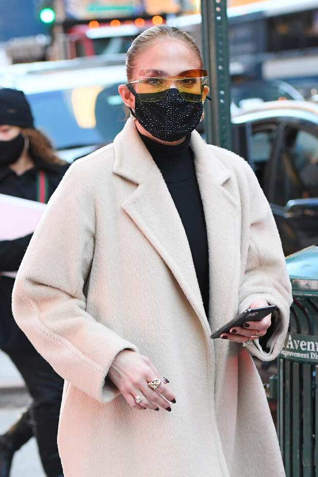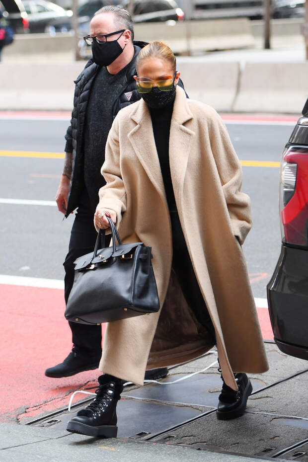 Присоединилась к этому тренду и Дженнифер Лопес — и показала, как носить хайкеры с бежевым пальто. Она вышла на щопинг в Нью-Йорке в оверсайз-пальто оттенка "кэмел", кожаных легинсах, простой черной водолазке и массивных хайкерах на платформе. С помощью грубой обуви она добавила остроты классическим базовым вещам — и поддержала мощный тренд этого сезона. Но самым любопытной деталью стала маска. Певица и актриса, разумеется, не могла надеть простую медицинскую — и выбрала вариант, усыпанный кристаллами! Вполне в духе ее собственного гардероба нулевых — тем более что мода того времени активно возвращается.