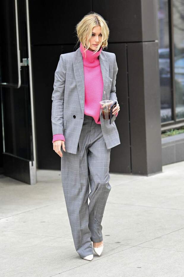 Для этого у нашей героини есть несколько приемов. Во-первых, супруга Джастина Бибера выбрала жакет с лого на спине, а логомания сегодня востребована, как никогда. А во-вторых, к спокойной серой двойке Хейли добавила объемный розовый свитер с высоким горлом — невероятно уютный! — серьги-хулахупы и светлые остроносые лодочки — ну как в таком образе не попасть во все хроники стритстайла.