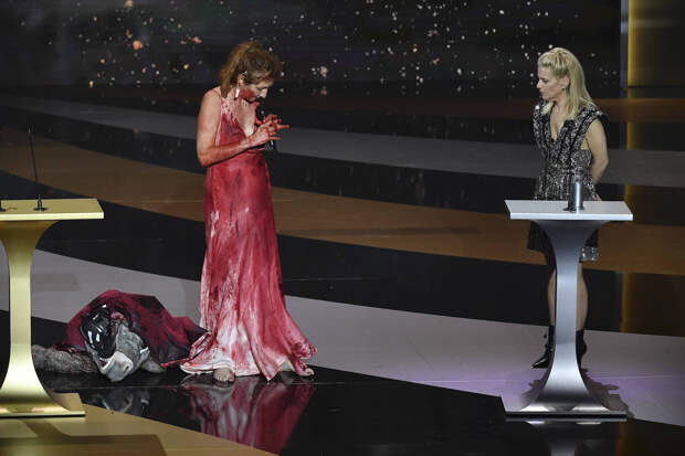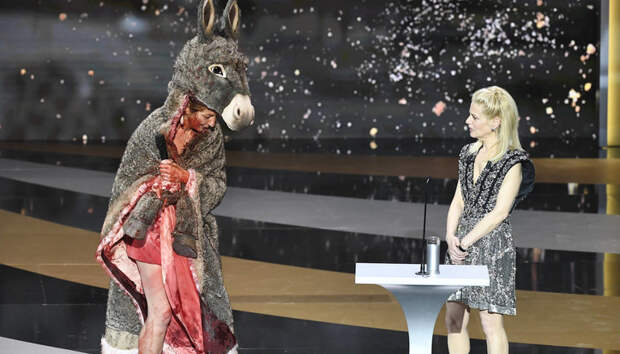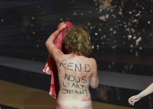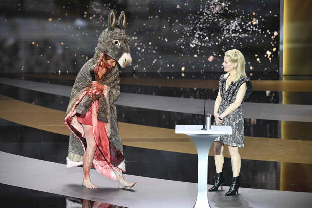 Далее девушка устроила целый перфоманс. Она произнесла речь в поддержку активистов, которые выступают во французских театрах за то, чтобы в стране открыли культурные учреждения. Они закрыты уже год из-за пандемии коронавируса. После своих слов Корина Масьер скинула ослиную шкуру и осталась в одном платье-комбинации, облитом красной краской.
