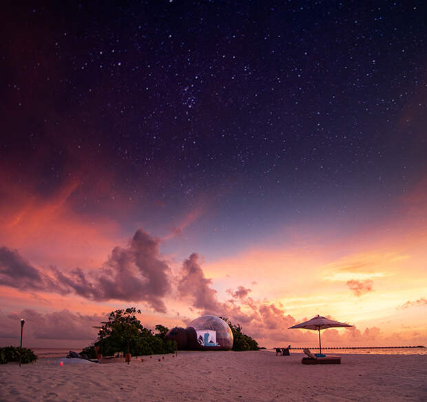 К слову об instagrammable локациях: для пар у Seaside Finolhu имеется еще один козырь в рукаве, отдельный номер прямо на пляже под прозрачным куполом, который надежно укрыт от посторонних глаз. Так как отель — популярное место для свадебных церемоний, к сьюту для молодоженов тут подошли с фантазией. “Виллу” Beach Bubble можно снять от заката до рассвета, чтобы наслаждаться звездным небом и, конечно же, друг другом.