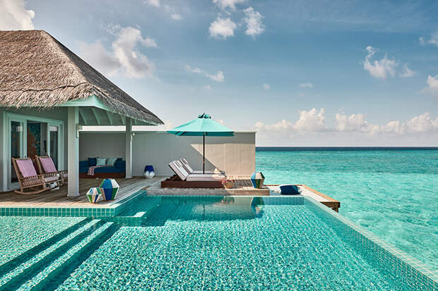 Начало коллекции отелей Seaside Hotels положил еще в 1969 году Тео Герлах. Предприниматель хотел открыть по всей планете места, где бы мечтал отдыхать сам — и с тех пор этим принципом руководствуются во всех 11 бутик-отелях сети. Так, для обновления вилл на мальдивском курорте его команда пригласила лондонское дизайн-бюро Muza Lab и его основательницу Инге Мур. Общая концепция сложилась сразу: все оттенки синего в Индийском океане, изумрудные листья пальм на фоне золотых песков и переливы розового и персикового на закате натолкнули дизайнера на образ калейдоскопа. Он нашел воплощение не только в ярком и графичном оформлении 125 вилл, но и в их обстановке: Инге собрала на курорте настоящие сокровища от ремесленников со всех уголков планеты, включая статуэтки с острова Ява, люстры ручной работы из Южной Африки и другие произведения декоративно-прикладного искусства. Обновление коснулось и общественных пространств: четырех ресторанов, SPA и детского клуба. Но о них чуть позже.