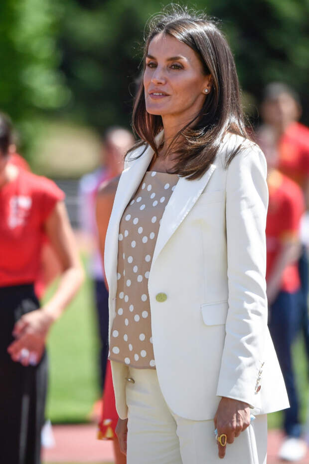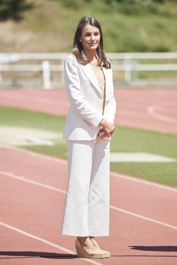 Наша героиня составила безупречный образ, идеальный для летнего делового гардероба. Летиция подчеркнула свою стройную фигуру белоснежным костюмом, состоящим из жакета с золотыми пуговицами и кюлот. Жена Филиппа VI дополнила аутфит кремовой блузой с принтом в "горох".