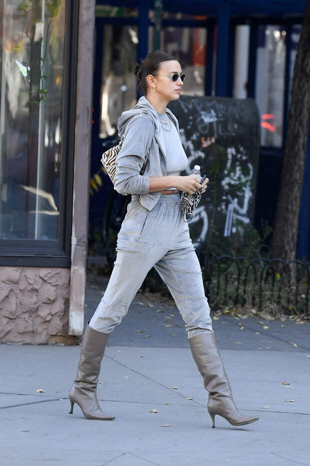 Однако в 2020 году велюр носят иначе, чем два десятилетия назад. Ирина вышла на Манхэттен в эффектном комплекте. Наша героиня составила монохромный тотал-лук серого цвета: велюровый костюм она дополнила удобным топом бренда Ким SKIMS. При этом бывшая возлюбленная Брэдли Купера добавила образу изюминки, надев высокие кожаные сапоги на каблуке By Far оттенка молочного шоколада. Микросумка с принтом под зебру, защитная маска в тон и овальные солнцезащитные очки - Ирина сделала ставку на минимум аксессуаров, и явно не прогадала.