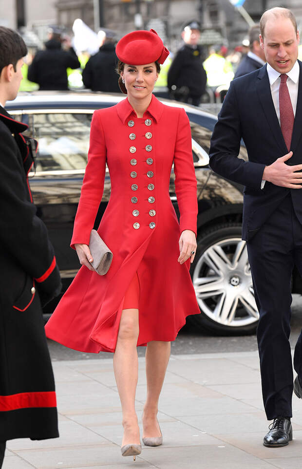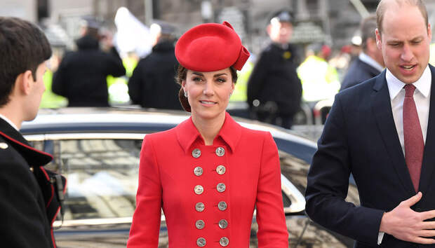 На голове герцогини был необычный убор в тон верхней одежде, а на ногах - атласные лодочки глубокого изумрудного оттенка.Компанию Меган составил не только ее супруг принц Гарри, но и его брат Уильям с женой Кейт. Миддлтон, будучи адептом разумного потребления, предпочла для выхода алое двубортное пальто Catherine Walker, которое надевала уже не раз (впервые мы видели его на ней в 2014 году). Также герцогиня надела шляпку с бантом и нюдовые замшевые лодочки. Обе герцогини пребывали в отличном расположении духа - вопреки слухам о разладах в их отношениях.