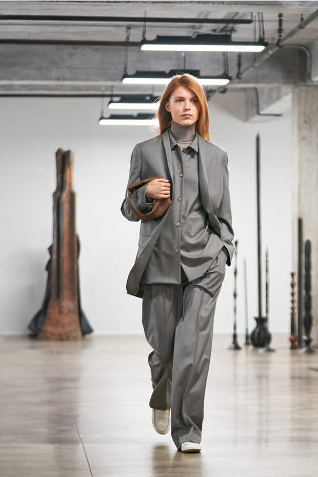 Костюм же, наоборот, тело скорее скрывал: широкие брюки, закрытый жилет и жакет с преувеличенно широкими плечами — совсем не тот набор, который ассоциируется у кого-то с солнечной сестрой Хадид. И в этот момент все, пожалуй, увидели модель в совершенно новом ключе.Никогда не показывать тело, даже не намекать на него — постоянная политика марки сестер Олсен. Обнаженной кожи на подиуме в этот раз почти не было — руки скрылись под перчатками в тон костюмов, щиколотки не показывались из-под длинных юбок и брюк, и открытыми остались в итоге одни только лица. Это пожалуй, можно назвать той самой скромной модой, о которой все заговорили несколько лет назад. Скромной не по принуждению, а по выбору — эта отстраненность от телесного, объектного в случае The Row именно что о свободе, нежелании объясняться с кем-то, что-то доказывать. В абсолютной самодостаточности. Конечно, то же отношение можно нести с собой в мир в совершенно любом наряде — даже в леопардовом мини, если прийти к высшему уровню осознанности. Но именно образы из коллекций The Row все-таки останутся в нашей памяти как абсолютное визуальное воплощение этой идеи в моде.