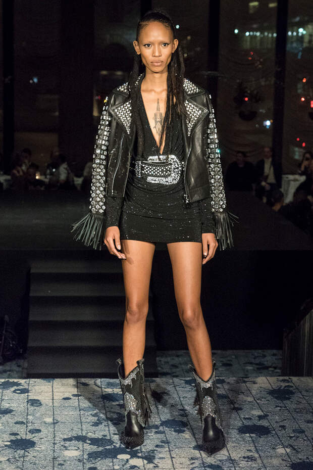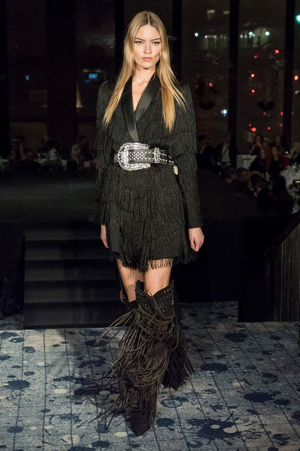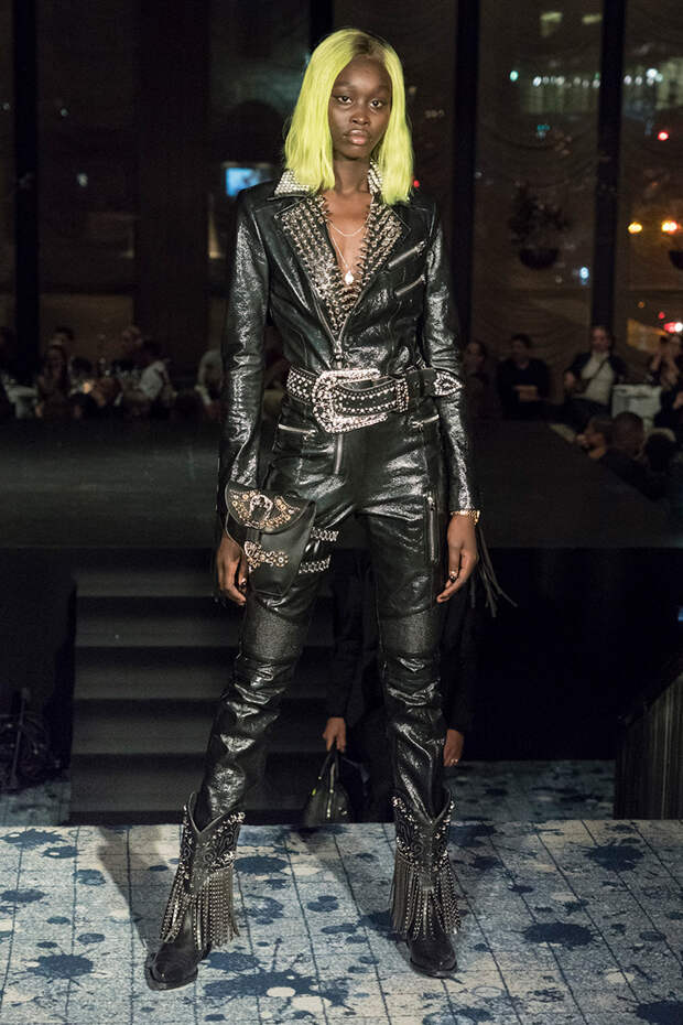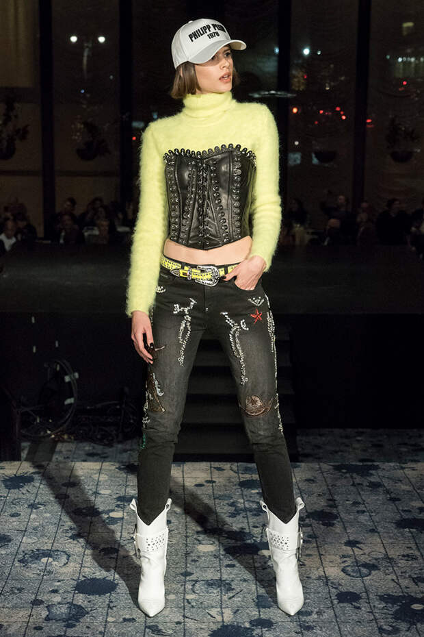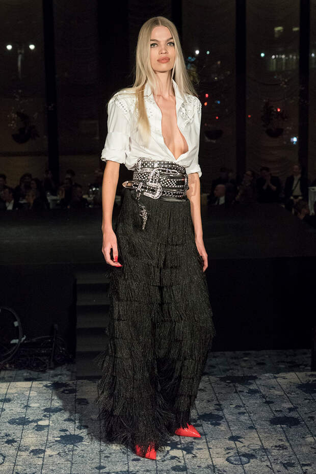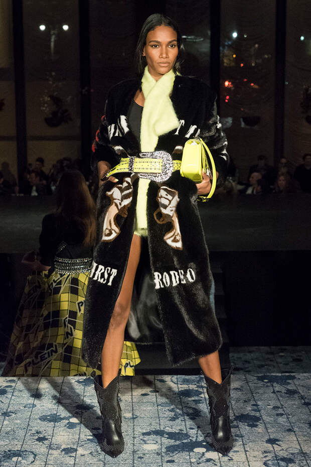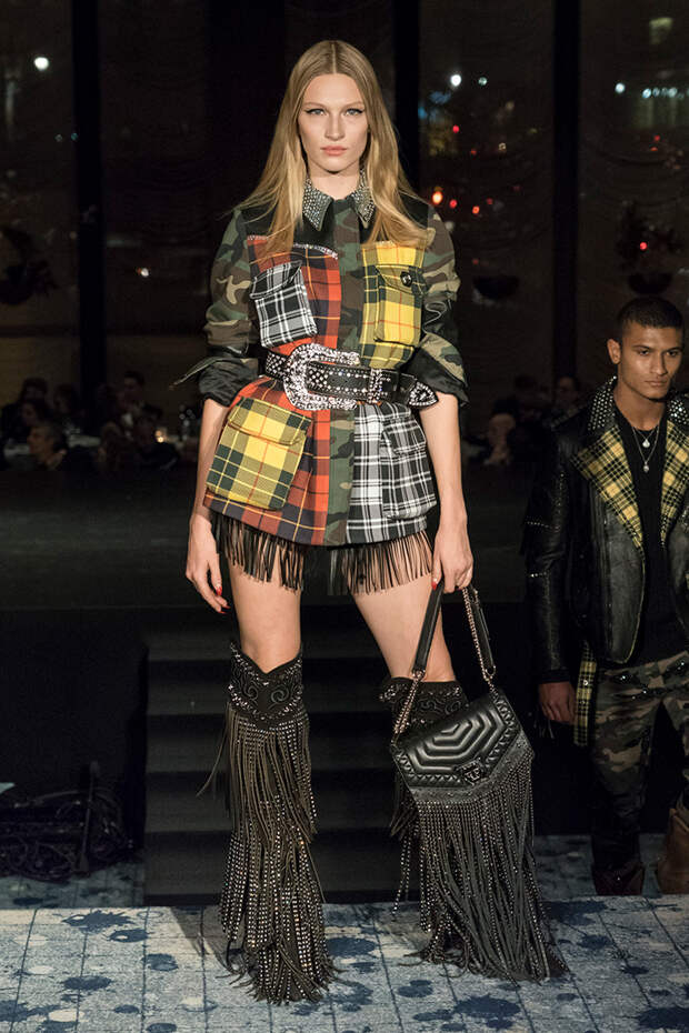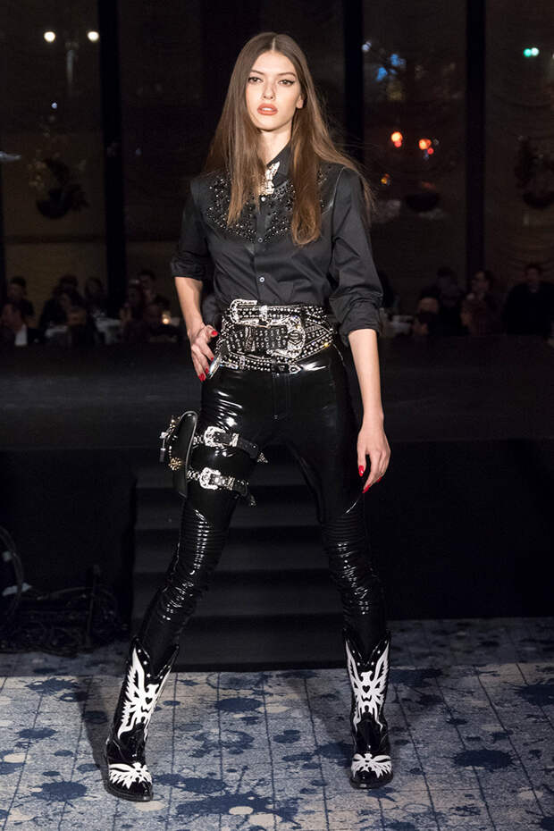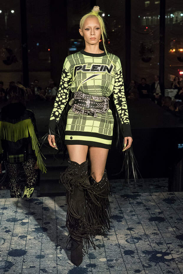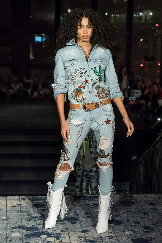 Подпись Уэста он попросту подделал, миллион положил в карман — и был таков. Во всяком случае, так звучала первая версия этой захватывающей истории. Теперь известно и имя друга, и сразу несколько альтернативных версий, и вообще все вероятно на самом деле было совсем не так. Углубляться не будем: пусть легенда остается легендой.В самой же коллекции все как всегда: чересчур и через край. Все — от огромных усыпанных стразами пряжек на ремнях до джинсовых костюмчиков — сияет; то, что не сияет — светится неоновым светом в темноте; а то, что не светится, блестит — потому что сшито из лакированной кожи. Шотландская клетка, леопард, камуфляж, ковбои, психоделично раскрашенные сапожки-казаки, кобуры на подвязках чулок, бахрома длиной с косу Рапунцель — те, кто любит Пляйна, любят его как раз за такое. Те, кому нужен концепт, минимализм, революционный крой, просто идут на другие шоу.