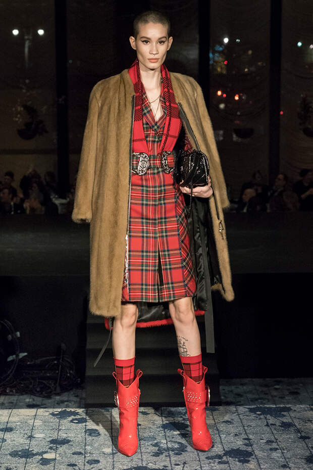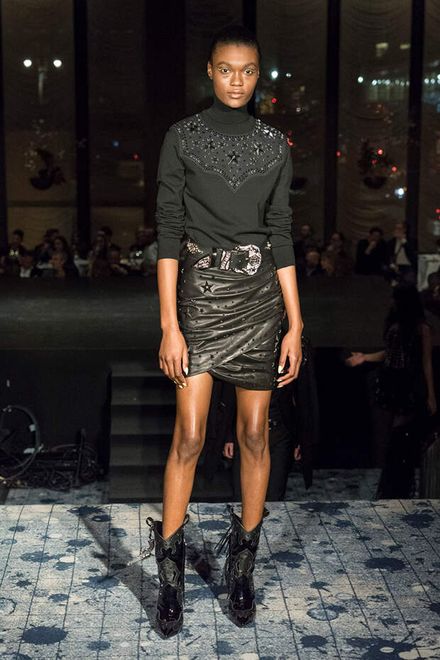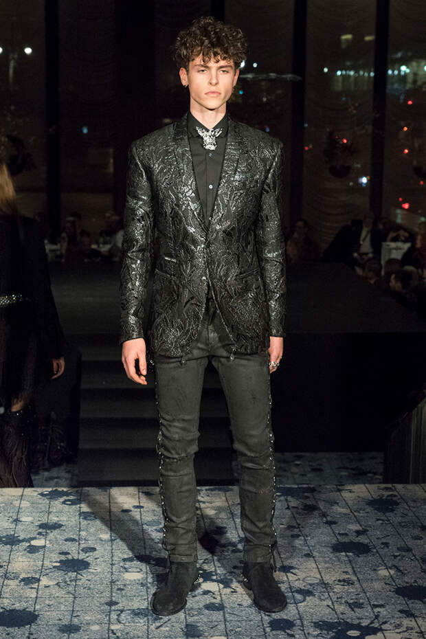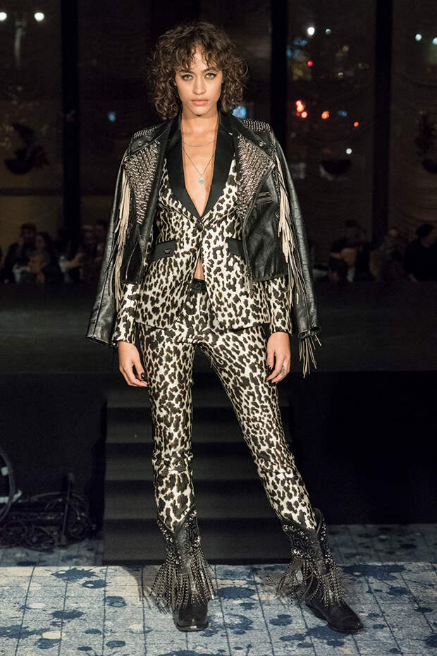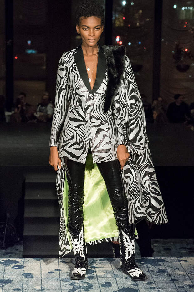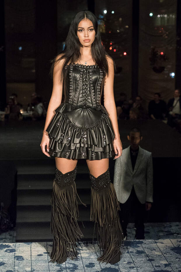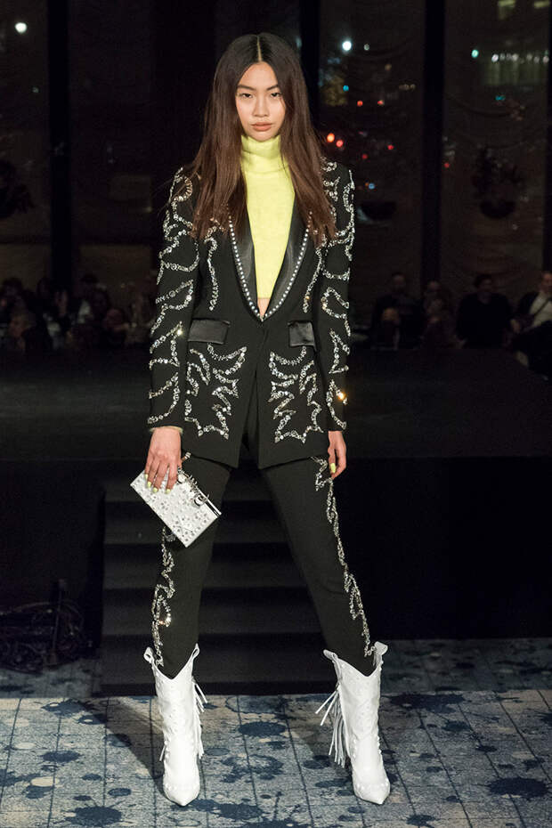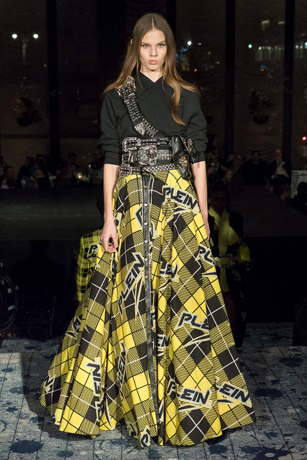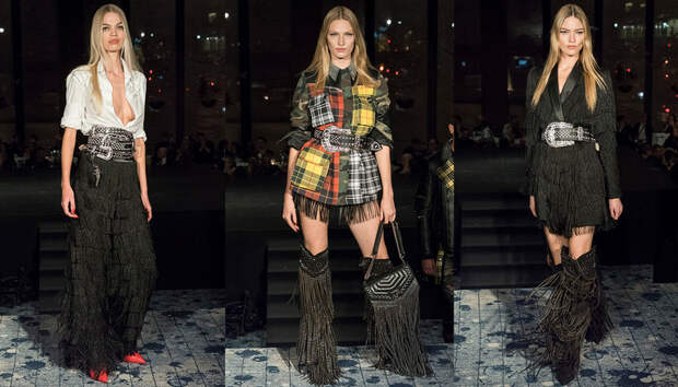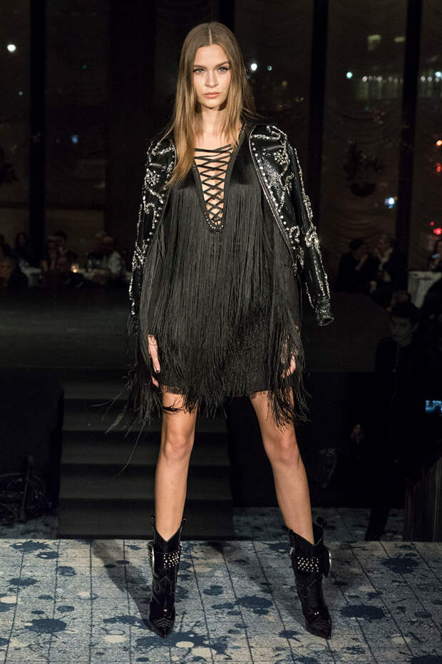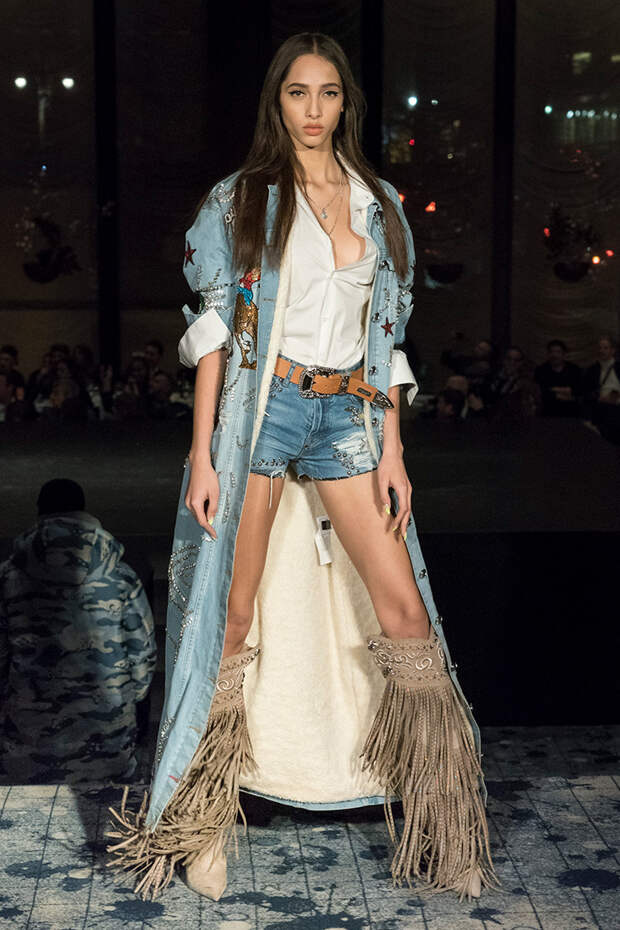 Подпись Уэста он попросту подделал, миллион положил в карман — и был таков. Во всяком случае, так звучала первая версия этой захватывающей истории. Теперь известно и имя друга, и сразу несколько альтернативных версий, и вообще все вероятно на самом деле было совсем не так. Углубляться не будем: пусть легенда остается легендой.В самой же коллекции все как всегда: чересчур и через край. Все — от огромных усыпанных стразами пряжек на ремнях до джинсовых костюмчиков — сияет; то, что не сияет — светится неоновым светом в темноте; а то, что не светится, блестит — потому что сшито из лакированной кожи. Шотландская клетка, леопард, камуфляж, ковбои, психоделично раскрашенные сапожки-казаки, кобуры на подвязках чулок, бахрома длиной с косу Рапунцель — те, кто любит Пляйна, любят его как раз за такое. Те, кому нужен концепт, минимализм, революционный крой, просто идут на другие шоу.