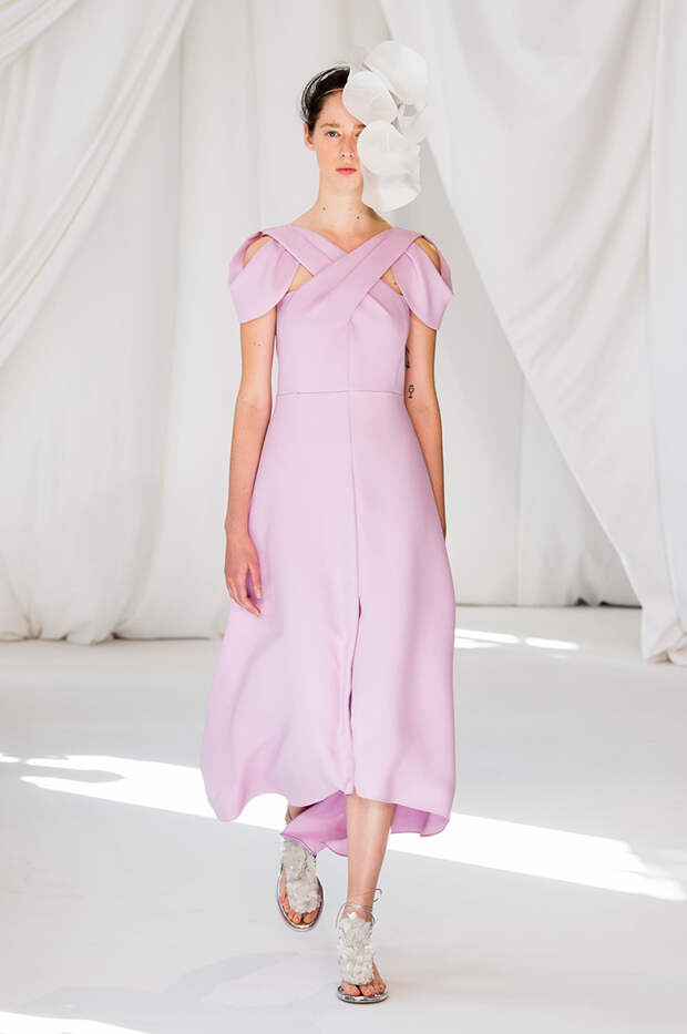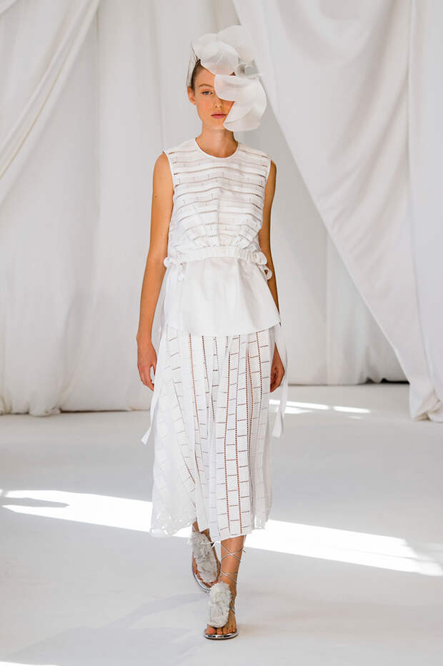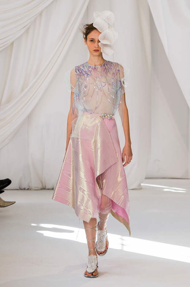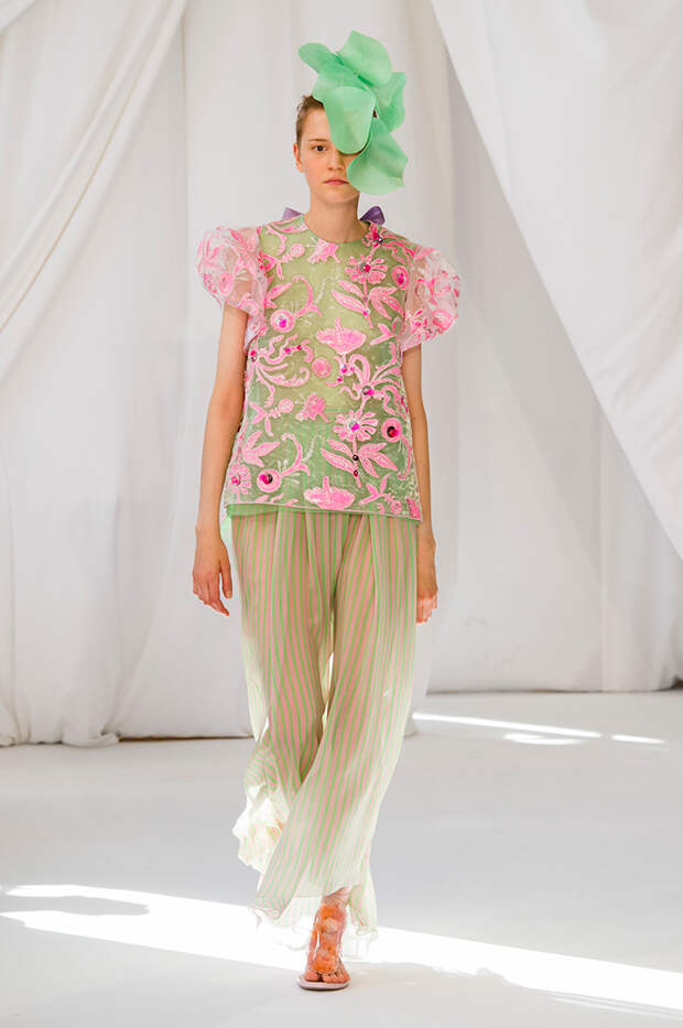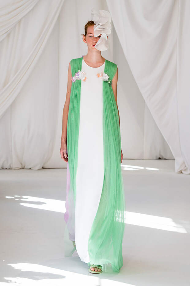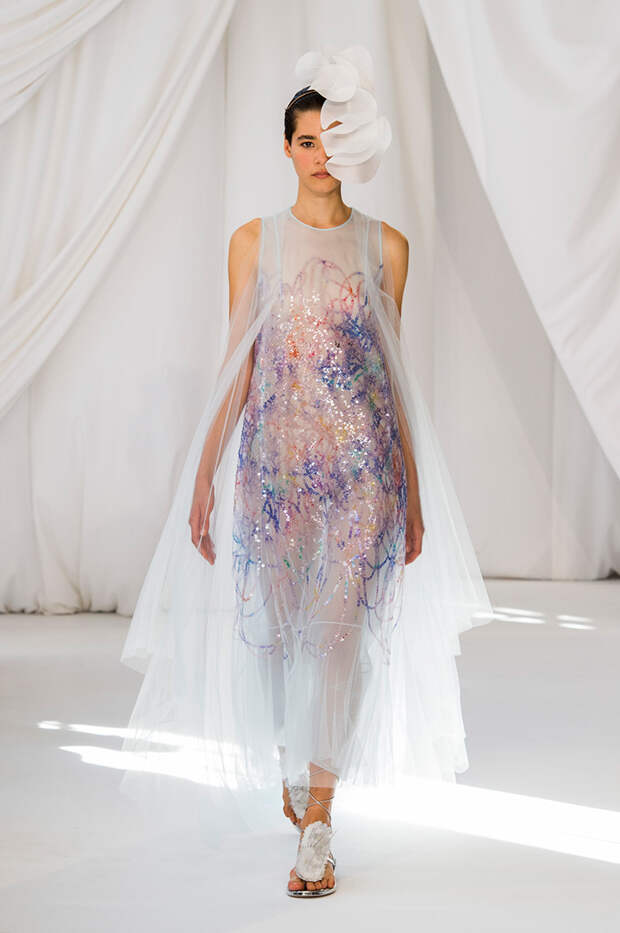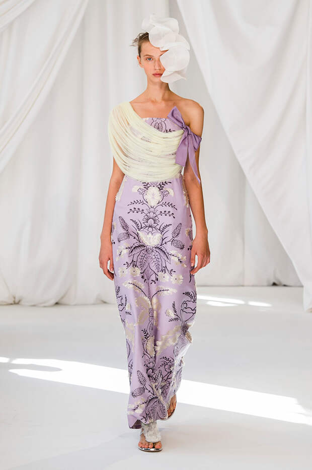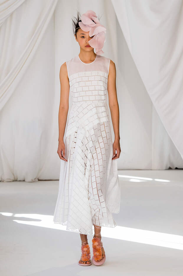 Если в прошлых сезонах Delpozo предлагали довольно строгие, но в то же время женственные наряды, за что так полюбились Мелании Трамп, то для следующих весны и лета испанский бренд обратился к более сложным силуэтам и большему разнообразию материалов. Здесь есть и полупрозрачные платья, украшенные хаотичными узорами из пайеток, и комбинезоны без рукавов из плотной перламутровой ткани, и просвечивающий кейп с вышивкой в виде цветов, и костюм из гобеленового материала и много другое.
