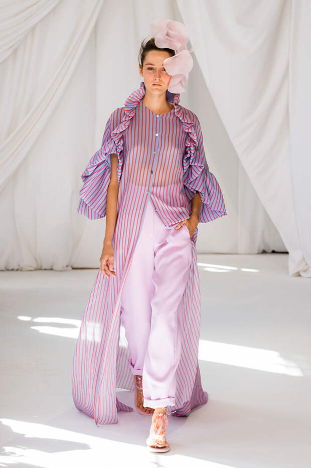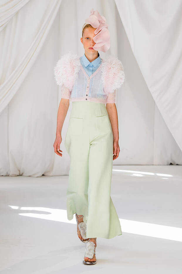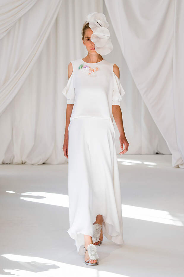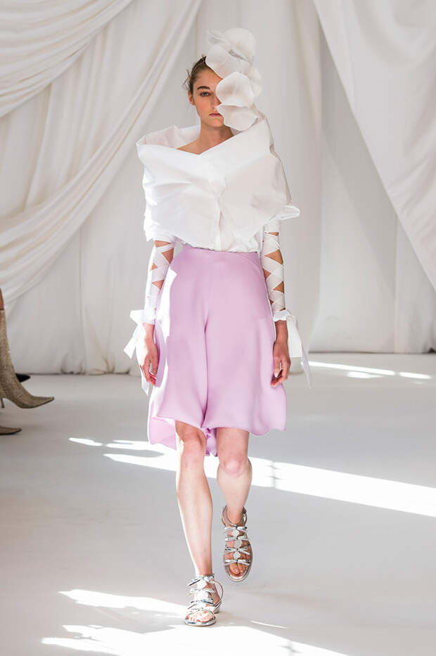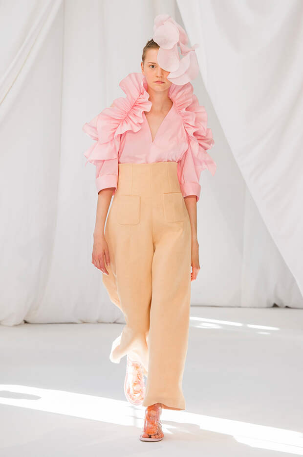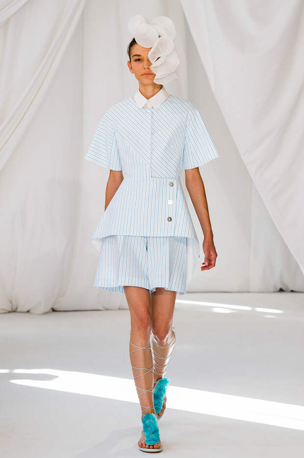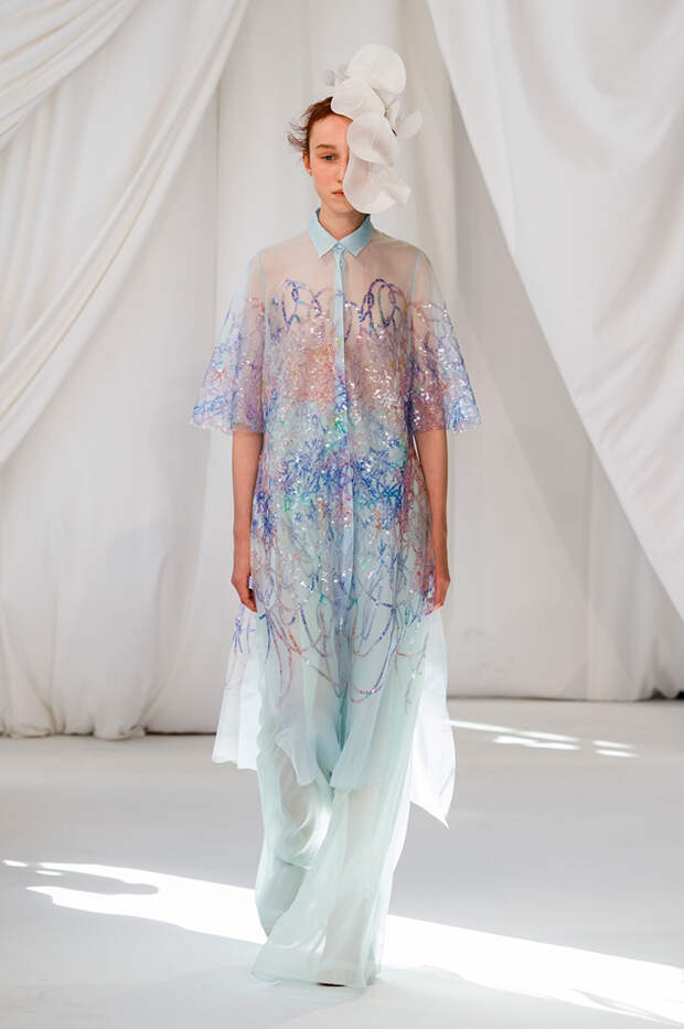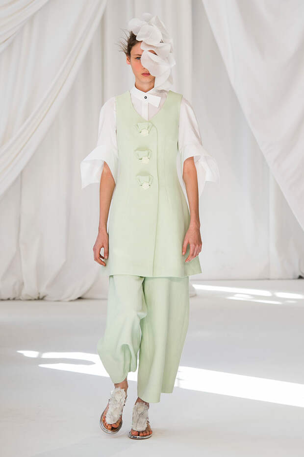 Если в прошлых сезонах Delpozo предлагали довольно строгие, но в то же время женственные наряды, за что так полюбились Мелании Трамп, то для следующих весны и лета испанский бренд обратился к более сложным силуэтам и большему разнообразию материалов. Здесь есть и полупрозрачные платья, украшенные хаотичными узорами из пайеток, и комбинезоны без рукавов из плотной перламутровой ткани, и просвечивающий кейп с вышивкой в виде цветов, и костюм из гобеленового материала и много другое.