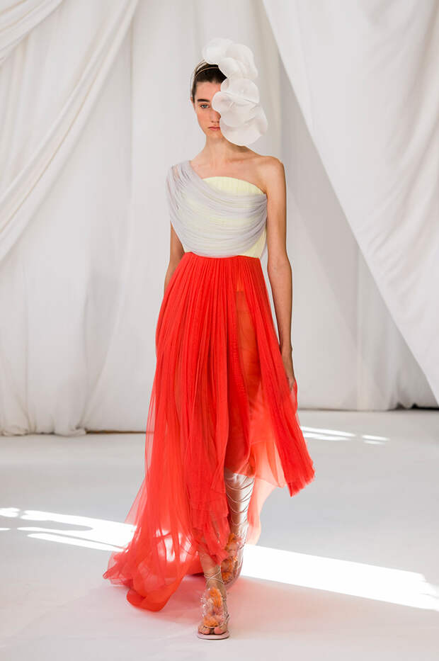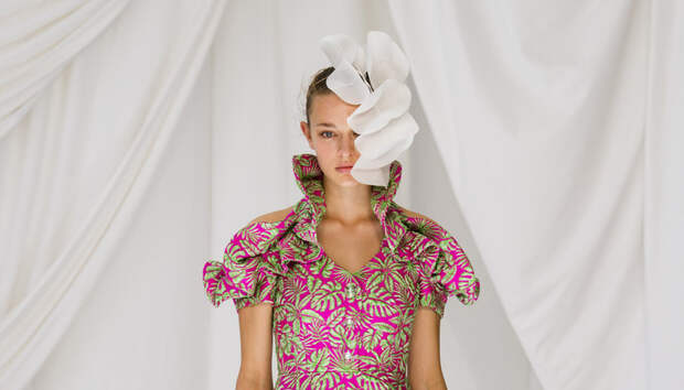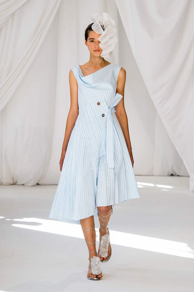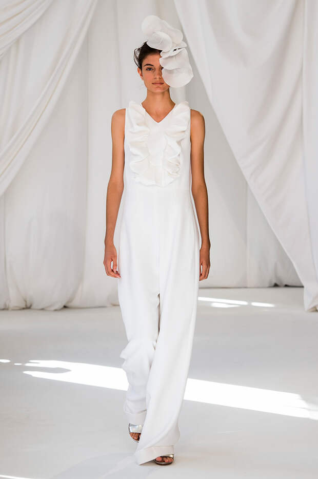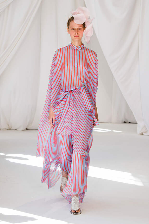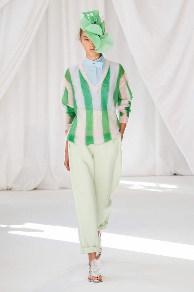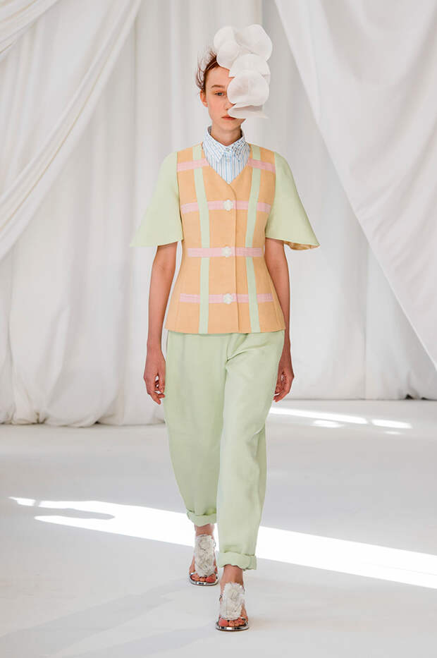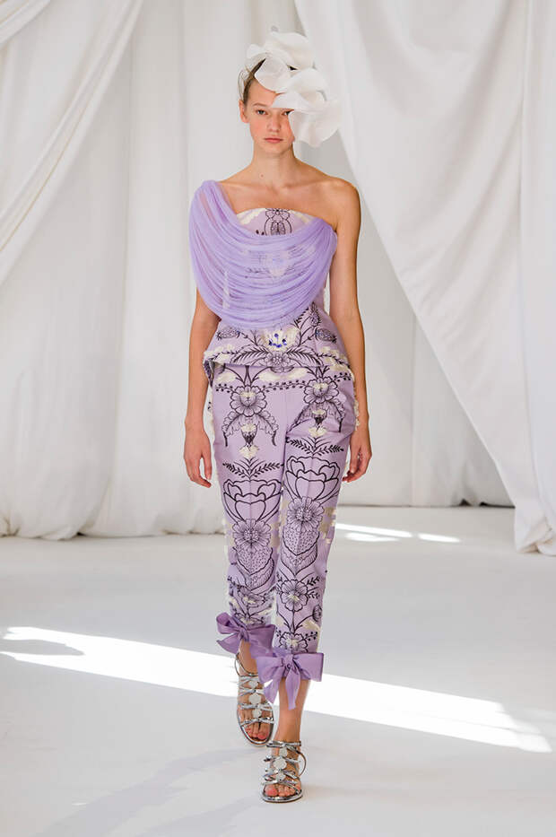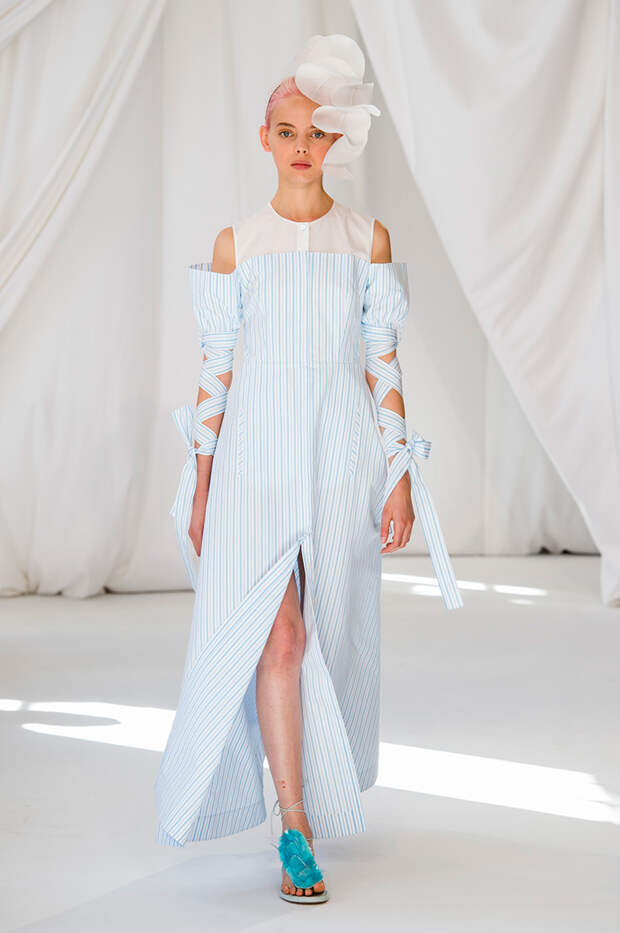 Если в прошлых сезонах Delpozo предлагали довольно строгие, но в то же время женственные наряды, за что так полюбились Мелании Трамп, то для следующих весны и лета испанский бренд обратился к более сложным силуэтам и большему разнообразию материалов. Здесь есть и полупрозрачные платья, украшенные хаотичными узорами из пайеток, и комбинезоны без рукавов из плотной перламутровой ткани, и просвечивающий кейп с вышивкой в виде цветов, и костюм из гобеленового материала и много другое.