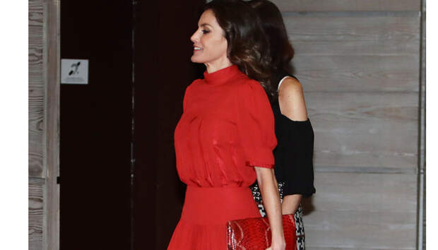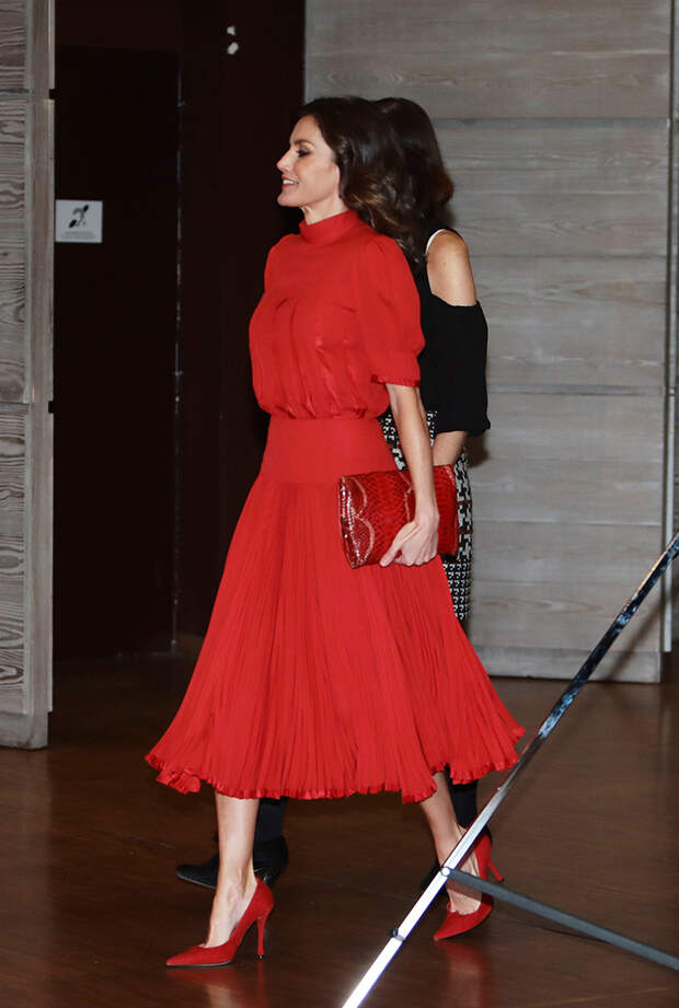 Мы полагали, что уже смело можно составлять рейтинг лучших нарядов королевы Летиции за этот год. Но не тут-то было: оказалось, что один из самых ярких (во всех смыслах!) выходов супруги Филиппа VI ждал нас сегодня, 19 декабря. Монаршая особа вышла в свет в наряде алого цвета: летящей юбке плиссе ниже колена, шифоновой блузке, замшевых лодочках и с кожаным прямоугольным клатчем.