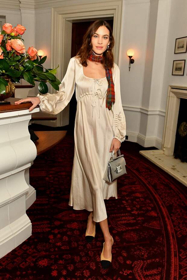 Алекса Чанг смело экспериментирует, чтобы разнообразить привычные зимние наряды для будней и выходов в свет. Так вышло и с этим женственным шелковым платьем молочного цвета актуальной длины мидакси (усредненный вариант между миди и макси). Алекса дополнила эту вещь в винтажном будуарном стиле на первый взгляд неподходящим аксессуаром — простым шерстяным шарфом в шотландскую клетку.