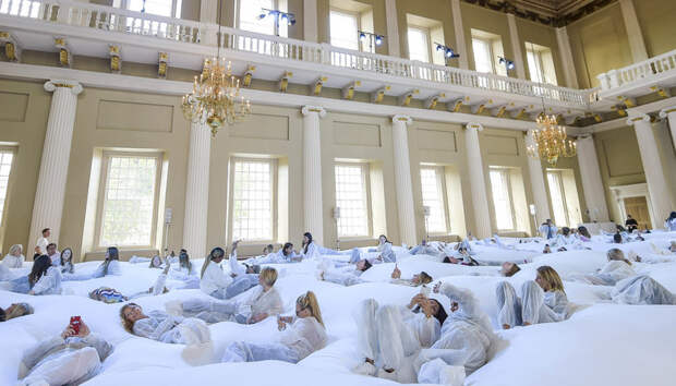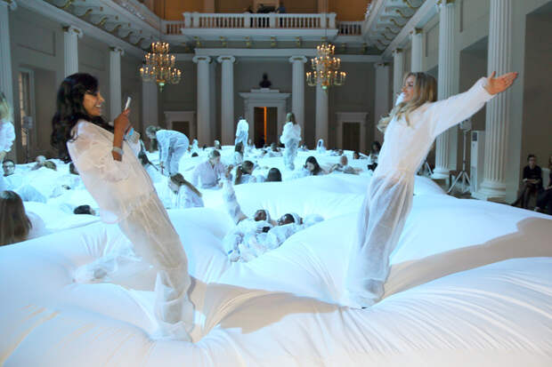 Хиндмарч считает, что такие акции помогут стать ближе к потребителю, а потому в рамках этой Недели моды в Лондоне устроила настоящий трехдневный перформанс.В помпезном Банкетинг-хаус под расписанным Питером Паулем Рубенсом потолком расположился белый батут в виде облака. Пока гости лежат, прыгают и всячески развлекаются на огромной подушке, им читают сказки и лекции об искусстве, а также проводят сеансы медитации. Акция Хиндмарч приурочена к новой коллекции аксессуаров, которую можно купить уже сейчас: сумкам, напоминающим подушки и с объемными карманами, и плюшевым брелкам.