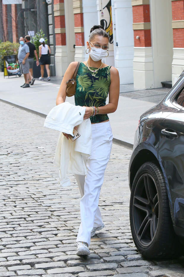 Белла Хадид для прогулки по Нью-Йорку выбрала очень летний лук в духе начала нулевых — зеленый топ с пальмами и широкие белые брюки. Дополнила свой образ 23-летняя модель массивными белыми кроссовками, большими серьгами-кольцами и солнцезащитными очками в узкой оправе. И, конечно, маской, — без нее сейчас вынужденно не обходится ни один выход знаменитостей на прогулку или даже красную ковровую дорожку.