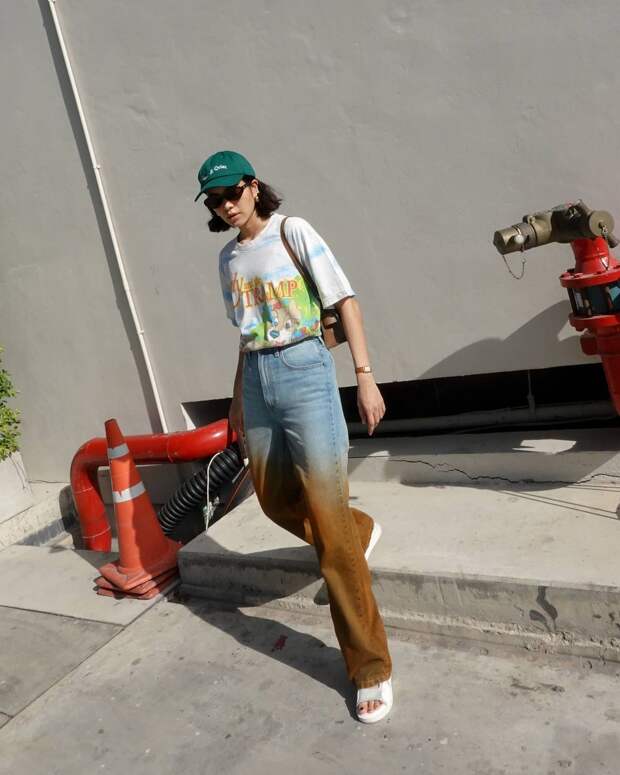 С чем же носить милые, забавные или дерзкие ретро-футболки? Беспроигрышное дополнение, которое первым приходит на ум — просторные джинсы. Подбирайте к винтажной футболке столь же ностальгическую вещь. Клеш, mom-fit или укороченные — и никаких скинни: ностальгировать по 2010-м мы пока не собираемся. А вот обувь должна быть современной. Здесь на помощь придут вьетнамки на платформе или каблуке либо массивные кроссовки.