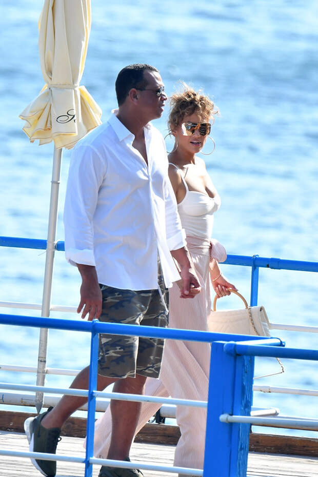 Обидно отдохнуть в Италии, не насладившись ее кухней. Дженнифер Лопез и Алекс Родригес покинули свою яхту у острова Капри и отправились на романтический ужин. Если на борту мы видим Джей Ло постоянно в спортивной форме, то для вечера в компании бойфренда певица выбрала более нежный образ: брюки-палаццо в бело-розовую полоску и топ на тонких бретелях, который подчеркивал загар и идеальную фигуру звезды.