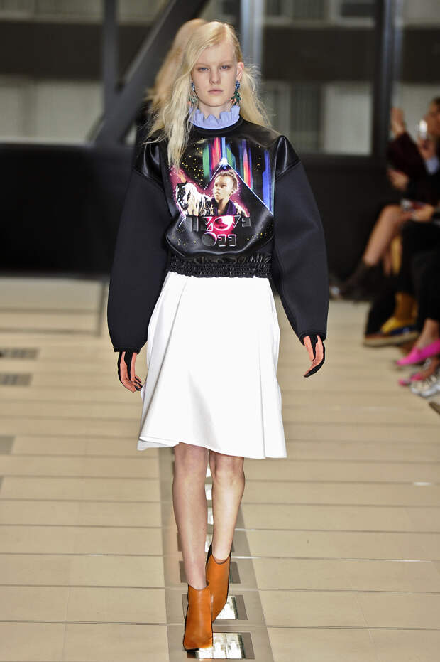 Не смог обойти вниманием тему космоса и Николя Жескьер — известный фанат научной фантастики. В осенне-зимней коллекции 2012 года для Balenciaga он создал офисную униформу будущего — с металлизированными тканями, жесткими юбками-трапециями, гипертрофированными плечами и принтами в духе постеров к sci-fi-фильмам 80-х. Эти самые принты на футболках и свитшотах из неопрена стали в тот сезон настоящим хитом — в стритстайл-хрониках они мелькали не реже сумок Chanel или туфель Prada, с которыми не так просто конкурировать.