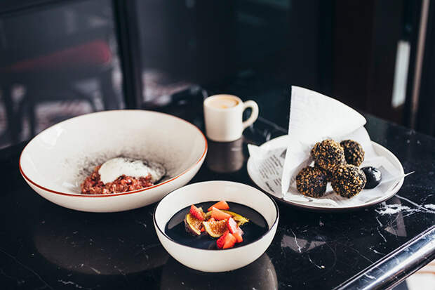 ). К нему же подают тосты из ржаного хлеба - и тут уже остановиться невозможно. Следом идет страчателла с розовым помидором, желтым арбузом, базиликовым маслом, черной солью и рукколой. Главным блюдом сета выступает томленая на собственном пару баранья лопатка с полентой, окрашенной муссом из шпината в изумрудный цвет; все это укрыто тонкими слайсами цуккини-гриль и тает во рту. Запомнился и ганаш из копченого шоколада с пряностями - его подают с дольками маринованной в пряном сахарном сиропе сливы, крупными хлопьями морской соли и съедобными фиалками. Стоимость сета – 1490 рублей.Адрес: Тверская, 23, стр. 1